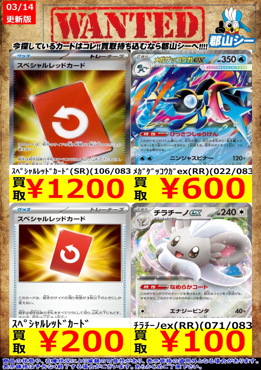 シーガル郡山店ポケカ数量限定お買取り情報更新です!よろしくお願いいたします! ※商品の状態や在庫状況により減額の可能性があり、表示価格の適用外となる場合がございます。 変化の書 ¥30 プリズムタワー ¥30 スピアーex(RR)(003/083) ¥100