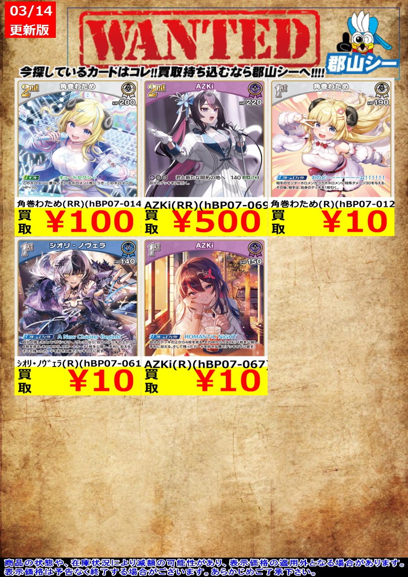 シーガル郡山店ホロライブOCGお買取り情報!! ※商品の状態や在庫状況により減額の可能性があり、表示価格の適用外となる場合がございます。 角巻わため(R)(hBP07-012) ¥10 AZKi(R)(hBP07-067) ¥10 シオリ・ノヴェラ(R)(hBP07-061) ¥10