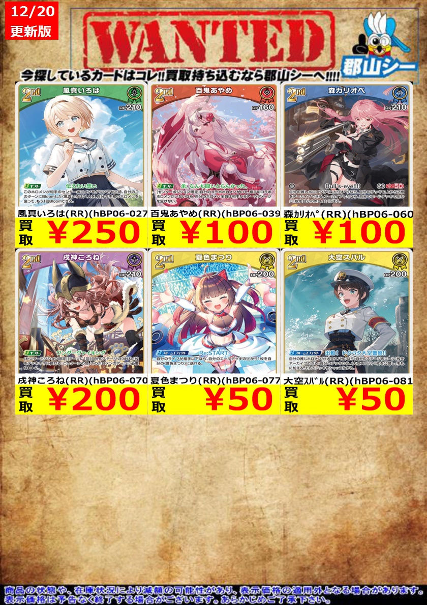 シーガル郡山店ホロライブOCGお買取り情報!! ※商品の状態や在庫状況により減額の可能性があり、表示価格の適用外となる場合がございます。 夏色まつり(RR)(hBP06-077) ¥50 大空スバル(RR)(hBP06-081) ¥50 森カリオペ(RR)(hBP06-060) ¥100