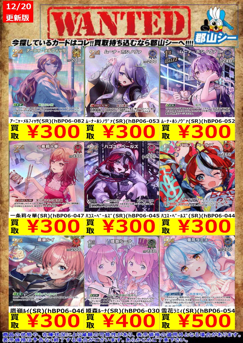 シーガル郡山店ホロライブOCGお買取り情報!! ※商品の状態や在庫状況により減額の可能性があり、表示価格の適用外となる場合がございます。 ハコス・ベールズ(SR)(hBP06-044) ¥300 ハコス・ベールズ(SR)(hBP06-045) ¥300 鷹嶺ルイ(SR)(hBP06-046) ¥300