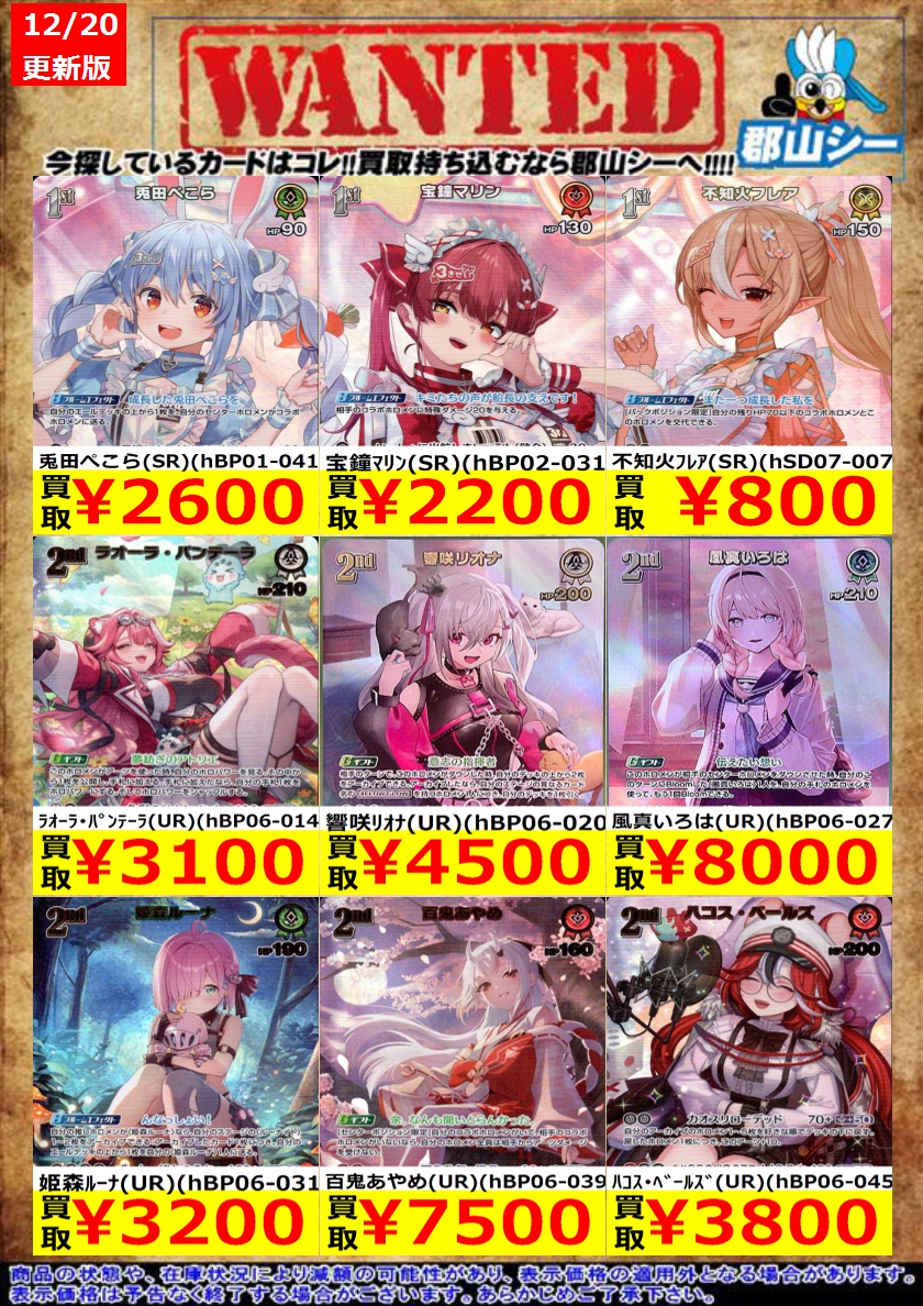 シーガル郡山店ホロライブOCGお買取り情報!! ※商品の状態や在庫状況により減額の可能性があり、表示価格の適用外となる場合がございます。 ラオーラ・パンテーラ(OUR)(hBP06-001) ¥4,500 夏色まつり(OUR)(hBP06-008) ¥7,500 ハコス・ベールズ(OUR)(hBP06-005) ¥8,500