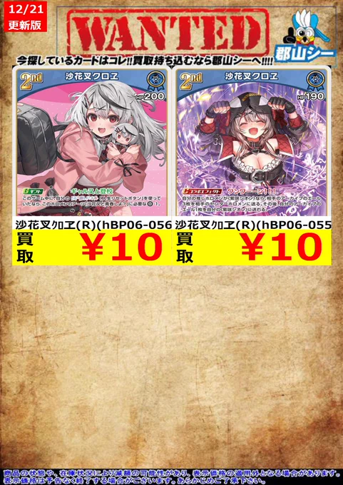 シーガル郡山店ホロライブOCGお買取り情報!! ※商品の状態や在庫状況により減額の可能性があり、表示価格の適用外となる場合がございます。 沙花叉クロヱ(R)(hBP06-056) ¥10 沙花叉クロヱ(R)(hBP06-055) ¥10 \\沙花叉まったく足りていないです……..//