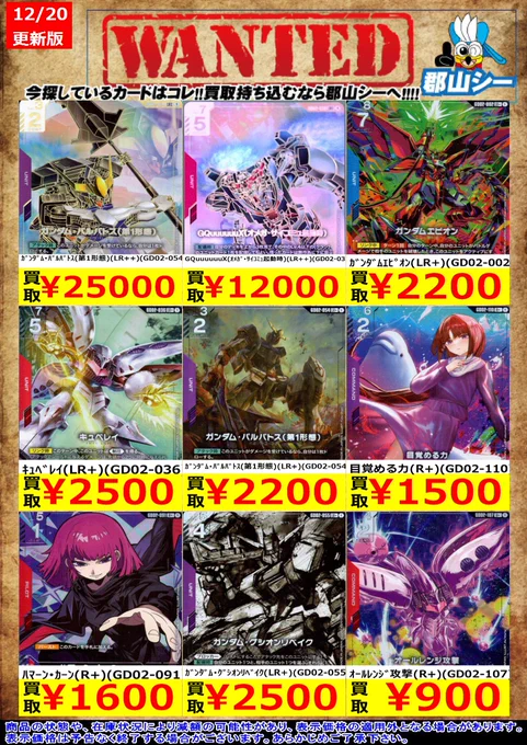 シーガル郡山店ガンダムCGお買取情報!! ガンダム・バルバトス(第1形態)(LR++)(GD02-054) ¥25,000 ガンダム・キマリス(LR+)(GD02-070) ¥100 アーガマ(R+)(GD02-129) ¥700
