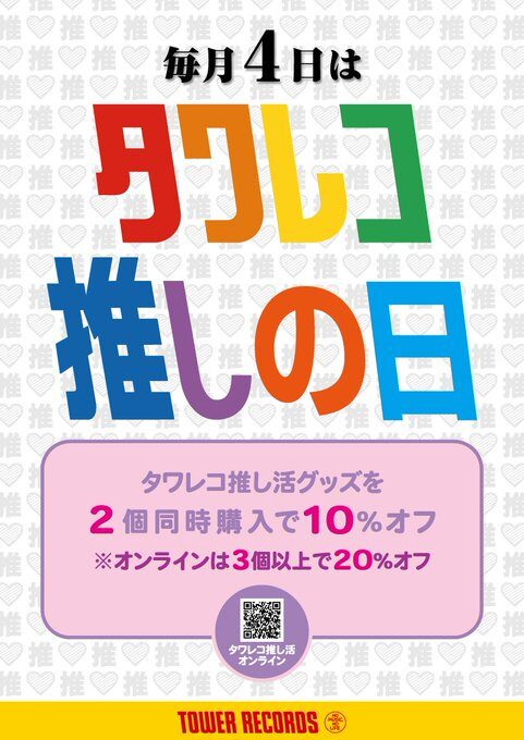 【#タワレコ推しの日】 \ 毎月04日は推し〈04〉の日!📢/ ❤️🧡💛💚💙💜🤎🖤🤍 毎月04日限定 のキャンペーン! ❤️🧡💛💚💙💜🤎🖤🤍 タワレコ推し活グッズを 2⃣個同時購入で🔟%オフ‼ お得なこの機会をお見逃しなく👀🉐 ✅