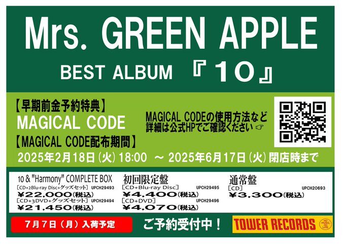 【Mrs. GREEN APPLE】 \\#ライラック も収録🎵// 7/8発売ベストアルバム『10』ご予約受付中🍏 店頭にて全額前金のご予約で 『MAGICAL CODE』(シリアルナンバー)をお渡し✨ \\6/17(火)再延長~📢// 詳細はコチラ ➡️tower.jp/article/featur… #MrsGREENAPPLE #MGA10 #MGA_MAGICAL10YEARS #ミセス