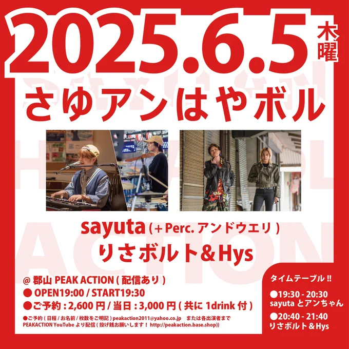 本日6/5開催‼️”さゆアンはやボル” ピークアクション(@PEAKACTION2011)にて! -出演- sayuta (+Perc. アンドウエリ) りさボルト&Hys 当日券や配信もございます🙌 お時間ある方はぜひ☺️
