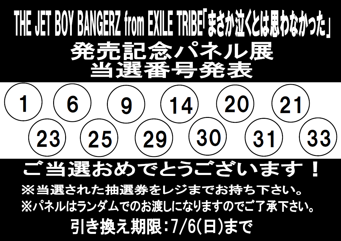 【#THEJETBOYBANGERZ】 『#まさか泣くとは思わなかった』発売記念 パネル抽選プレゼント当選番号発表です🎉 ご当選おめでとうございます😊 ※抽選券をタワーレコード郡山店レジカウンターまでお持ちください。 ※展示品の為汚れや傷がある場合があります。 ※店頭受取のみ。配送はできません。 #TJBB