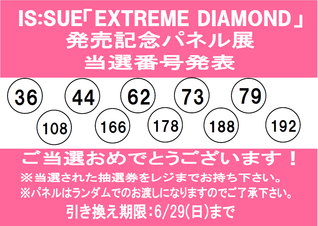 【IS:SUE】 『EXTREME DIAMOND』発売記念 パネル抽選プレゼント当選番号の発表です🎉 ご当選おめでとうございます😊 ※抽選券をタワーレコード郡山店レジカウンターまでお持ちの上ご来店下さい。 ※展示品の為汚れや傷がある場合があります。 ※店頭受取のみ。配送はできません。 #ISSUE