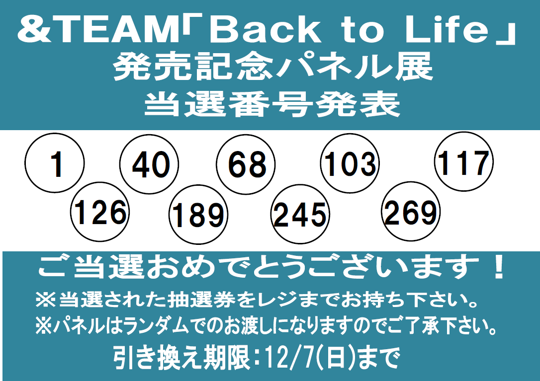 【&TEAM】 「#BacktoLife」 発売記念パネル抽選当選番号の発表です🎉 おめでとうございます😊 ※抽選券をタワレコ郡山店レジカウンターまでお持ちください。 ※展示品の為汚れや傷がある場合があります。 ※店頭受取のみ。配送はできません。 #andTEAM #앤팀