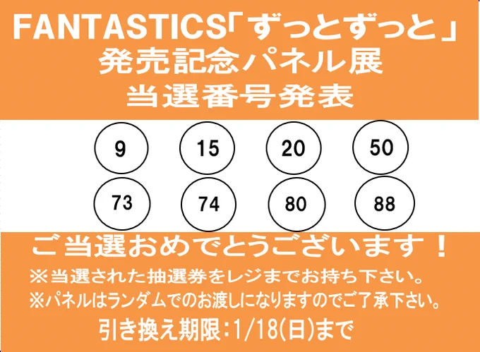 【#FANTASTICS】 「ずっとずっと」発売記念 パネル抽選プレゼント当選番号の発表です🎉 ご当選おめでとうございます😊 ※抽選券をタワーレコード郡山店レジカウンターまでお持ちの上ご来店下さい。 ※展示品の為汚れや傷がある場合があります。 ※店頭受取のみ。配送はできません。