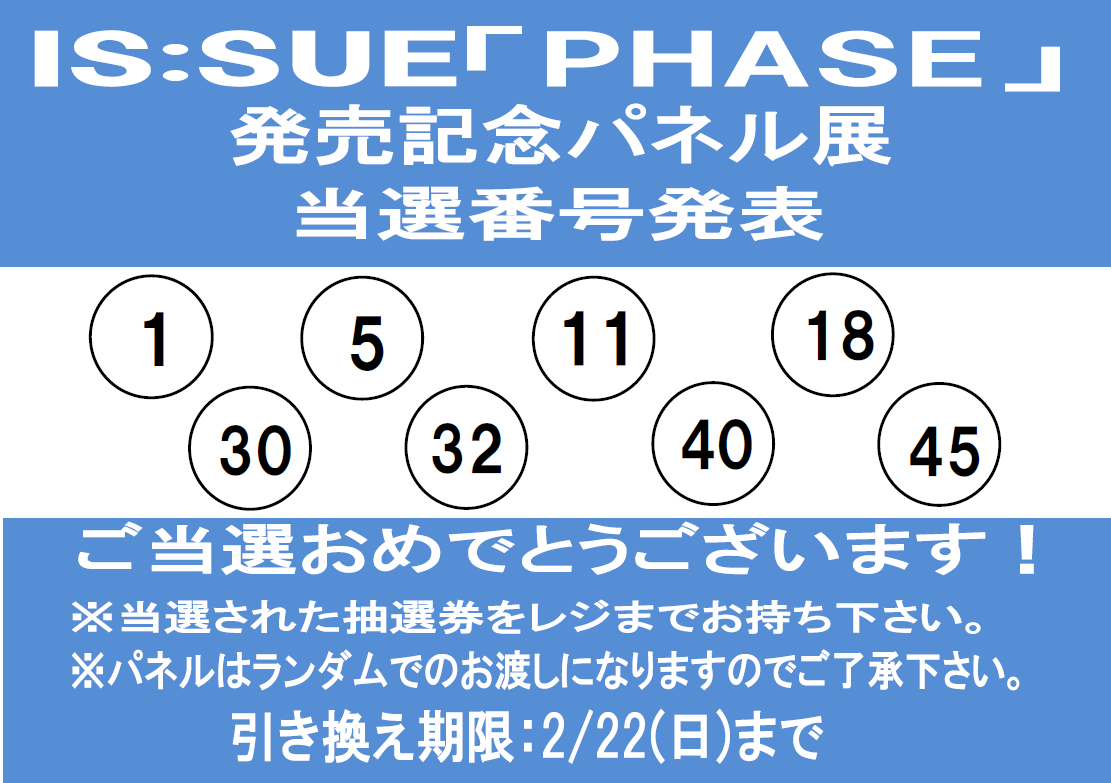 【IS:SUE】 IS:SUE「PHASE」発売記念 パネル抽選プレゼント当選番号の発表です🎉 ご当選おめでとうございます😊 ※抽選券をタワーレコード郡山店レジカウンターまでお持ちの上ご来店下さい。 ※展示品の為汚れや傷がある場合があります。 ※店頭受取のみ。配送はできません。