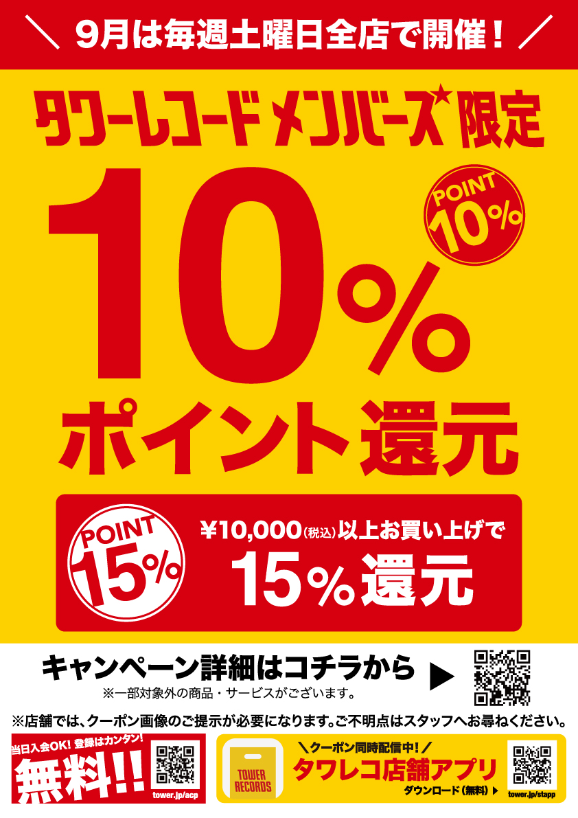 \お得なポイント還元キャンペーン実施中🎵/ 9月は毎週土曜日開催‼️ タワーレコードポイント10%/15%還元✨ アプリ、もしくはオンラインのクーポンバーコードをレジにてご提示ください‼️ 詳細はコチラ ➡️ #タワレコメンバーズ