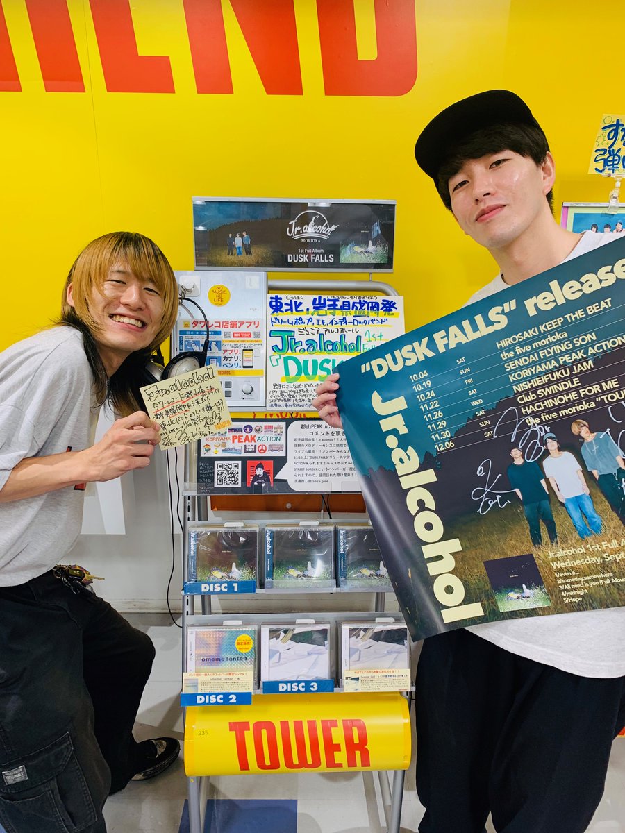 【#Jralcohol】 本日、全国流通盤『DUSK FALLS』が発売になったJr.alcoholのお2人が盛岡からご来店くださいました! 東北の岩手にこんなかっこいいバンドがいます。 10月から始まるリリースツアー11/22に郡山 #ピークアクション でライブ!渡邊店長もオススメのバンド、是非ライブを見て下さい!
