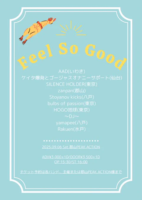 💃本日開催💃 郡山PEAKACTION おかちゃんpre 「Feel So Good」 open 15:30 / start 16:00 AAD SILENCE HOLDER Stoyanov kicks zanpan bulbs of passion HOGO地球 ケイタ爆発とゴージャスオナニーサポート -DJ- yamapee Rakuen 激アツなバンドが勢ぞろい🥳 皆さま是非お越しください✨