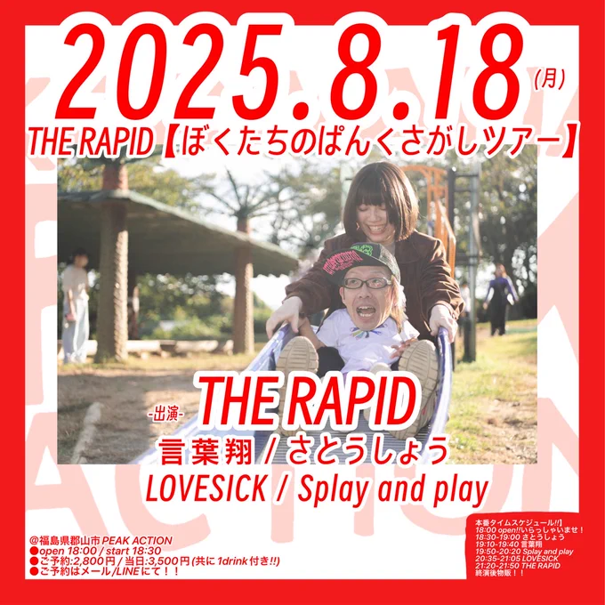 本日開催‼️ THE RAPID【ぼくたちのぱんくさがしツアー】郡山編 PEAK ACTION(@PEAKACTION2011)にて✨ -出演- THE RAPID 言葉翔 さとうしょう LOVESICK Splay and play 当日券ございます🙌 夏休みラストスパート まだまだ思い出作りましょう☀️🥳