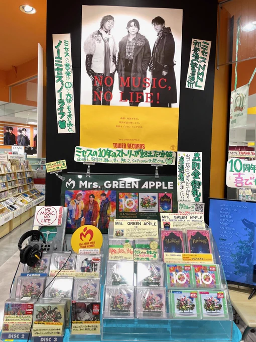 【#MrsGREENAPPLE🍏】 ベストアルバム『10 』 &映像『Mrs. GREEN APPLE on “Harmony”』 大好評発売中です🍏✨ 店内いたるところにミセス展開中🍏 コラボうちわも配布中🍏 ❝ミセスのアルバムCDを買う❞ショッピング体験をぜひ郡山店で🍏#MGA10#MGA_MAGICAL10YEARS