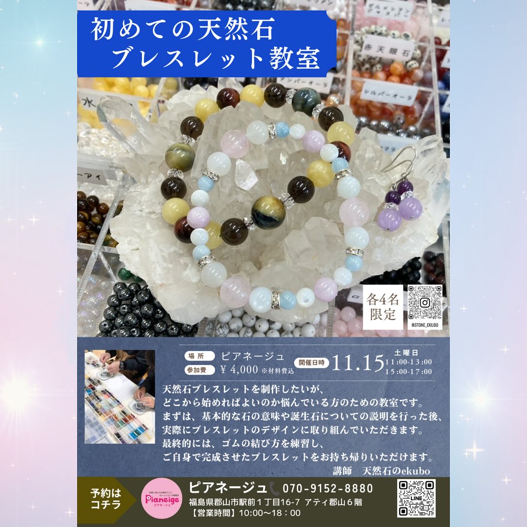 11/15(土)天然石ブレスレット講習会 天然石に詳しい先生が、 少人数制で教えてくれる貴重な講習会です! 石の勉強をしながら、 自分にあったブレスレットを作れます。 ゴムの結び方まで覚えられます。 早めに、ご予約お待ちしております 講師 天然石のekubo @stone_ekubo