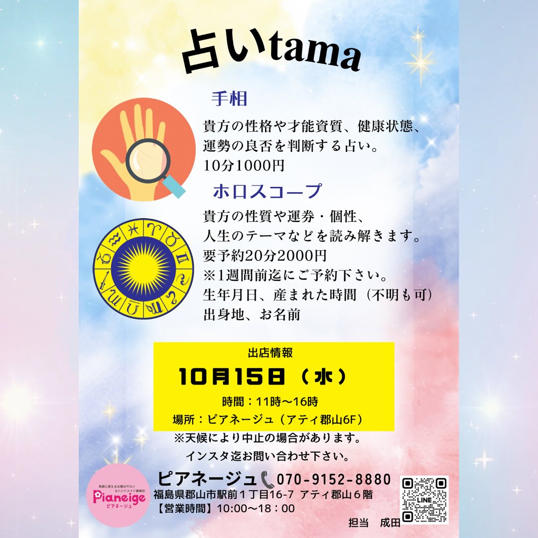 【ワークショップ情報】 @tama5577top 占いtama 作家さまによる 占いの日があります! ホロスコープは ✤生年月日 ✤産まれた時間(不明もOK) ✤出身地 ✤お名前 こちらの情報を 1週間前までお知らせください お気軽にDMでお問い合わせ お待ちしております ..𖥧 𖧧 ˒˒. 𖡼.𖤣𖥧 ⠜ . .𖥧 𖥧 𖧧 ˒˒. 𖡼.𖤣𖥧 ⠜ ワークショップして下さる 作家さま大募集中です ..𖥧 𖧧 ˒˒. 𖡼.𖤣𖥧 ⠜ . .𖥧 𖥧 𖧧 ˒˒. 𖡼.𖤣𖥧 ⠜ いいね️フォローを いただけますと、 大変励みになります。 〒963-8002 福島県郡山市駅前1丁目16-7 アティ郡山6階 ピアネージュ 10~18時(不定休) ..𖥧 𖧧 ˒˒. 𖡼.𖤣𖥧 ⠜ . .𖥧 𖥧 𖧧 ˒˒. 𖡼.𖤣𖥧 ⠜ #福島県 #郡山市 #pianeige #ピアネージュ #ピアネージュ郡山 #アティ郡山 #Ati郡山 #ハンドメイド #委託販売 #レンタルボックス #雑貨屋 #郡山雑貨屋 #レンタルスペース