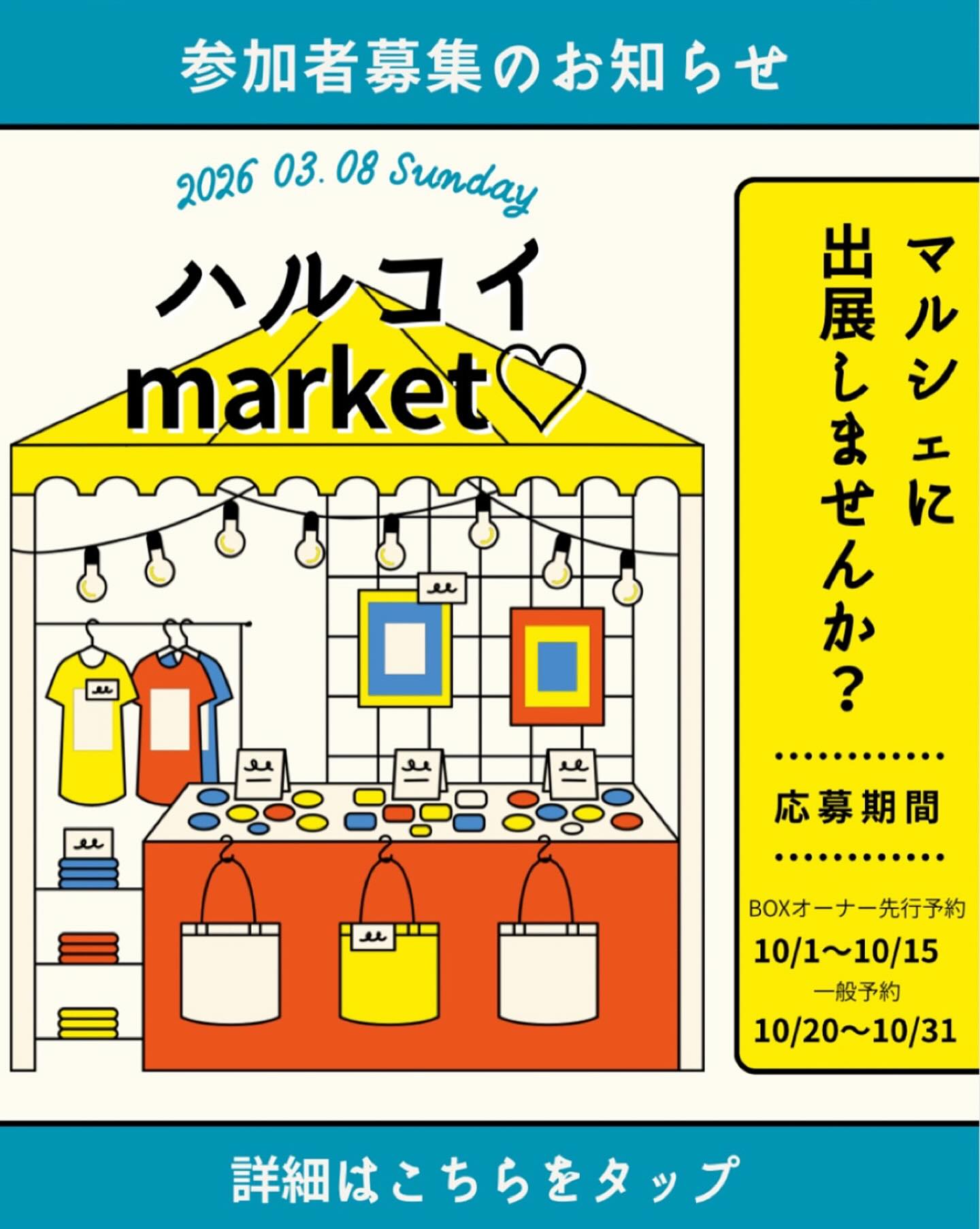 <ハルコイmarket♡ 出店者募集のお知らせ> BOXオーナー様先行:10月1日〜10月15日まで 一般募集:10月20日〜10月31日まで。 日にち:2026年3月8日 日曜日 時間:10:00〜15:00 場所:ビックパレットふくしまA 〒963-0115 福島県郡山市南2丁目52−52 ビッグパレットふくしま 搬入時間:9時から準備・搬入 (中の準備ができ次第、搬入可) 出展ブース数:約110ブース募集予定 物販、ワークショップ、占いなど キッチンカー 3ブース予定 スタンプラリー1点〜3点協力お願いします ブースのサイズ:約2m×約2m(おひとり様2ブースまで) ※テーブル、イスは基本持ち込みでお願いいたします。 貸出希望の方は別途いただきます。 テーブル(180cm×60cm)1脚150円 椅子1脚110円 お友達同士で出展されたい方は11月11日までお申し付けください。 遅くなりますとご希望に添えない場合がございます。 出店料:BOXオーナー様 4000円 一般募集の方 6000円 キッチンカーの方 6000円 ※電源は使用できません。 ポータブル電源かキッチンカーの方は発電機でご対応 お願いいたします。 どうしてもご希望の方は別途費用がかかります。 お申込み方法 インスタグラムDMから 1.お名前 2.ご連絡先 3.作家名 4.出店される作品の種類と写真1,2枚 (例えば 焼き菓子 クッキー、マフィン、マドレーヌなど なるべく細かくお願いいたします。) ワークショップの方はどんなワークショップをやるのかをご記入ください。 ※記入していただいた物以外の販売は禁止とさせていただきます。ワークショップと記載のない方の追加ワークショップも禁止です。 少し厳しいですが、なるべく作家様の作品がかぶらないようにさせていただきたいのでご面倒でもよろしくお願いいたします。 5.PR文 6.HPやインスタなどのアドレス お支払い方法:ピアネージュ店鋪又は振込 お支払い期間11月17日〜11月30日まで 振込希望の方は後日振込先をお伝えいたします。 チラシに関しては出来次第ご連絡いたします。 郵送はいたしませんので取りに来ていただけると助かります。 出店していただけるかは11月11日以降にご連絡いたします。 BOXオーナー様はお申込みいただきましたら出店確実となります。 ※申し訳ございませんがキャンセルによる出店料の返金はできません。 はじめての開催になりますが 皆さまが1日たのしかったなと思っていただける ようなハルコイmarket♡にしたいと思っています。 よろしくお願いいたします。 〒963-8002 福島県郡山市駅前1丁目16-7 アティ郡山6階 ピアネージュ 電話070-9152-8880 ハルコイ♡market @harukoimarket