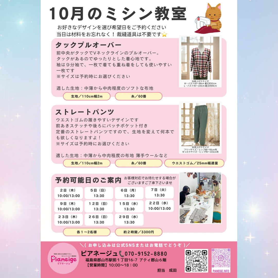 10月の『ミシン教室』決まりました 秋物にちょうど良い 9分袖のプルオーバーとストレートパンツ 写真の中から参加予定日を決め プルオーバーorパンツ サイズを決めて DM.LINE.電話などで ご予約お待ちしております