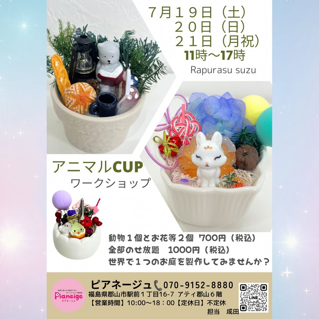 【ワークショップ情報】 @shell_21230 作家さまによる ワークショップがあります! お気軽にDMでお問い合わせ お待ちしております ..𖥧 𖧧 ˒˒. 𖡼.𖤣𖥧 ⠜ . .𖥧 𖥧 𖧧 ˒˒. 𖡼.𖤣𖥧 ⠜ ワークショップして下さる 作家さま大募集中です ..𖥧 𖧧 ˒˒. 𖡼.𖤣𖥧 ⠜ . .𖥧 𖥧 𖧧 ˒˒. 𖡼.𖤣𖥧 ⠜ いいね️フォローを いただけますと、 大変励みになります。 〒963-8002 福島県郡山市駅前1丁目16-7 アティ郡山6階 ピアネージュ 10~18時(不定休) ..𖥧 𖧧 ˒˒. 𖡼.𖤣𖥧 ⠜ . .𖥧 𖥧 𖧧 ˒˒. 𖡼.𖤣𖥧 ⠜ #福島県 #郡山市 #pianeige #ピアネージュ #ピアネージュ郡山 #アティ郡山 #Ati郡山 #ハンドメイド #委託販売 #レンタルボックス #雑貨屋 #郡山雑貨屋 #レンタルスペース