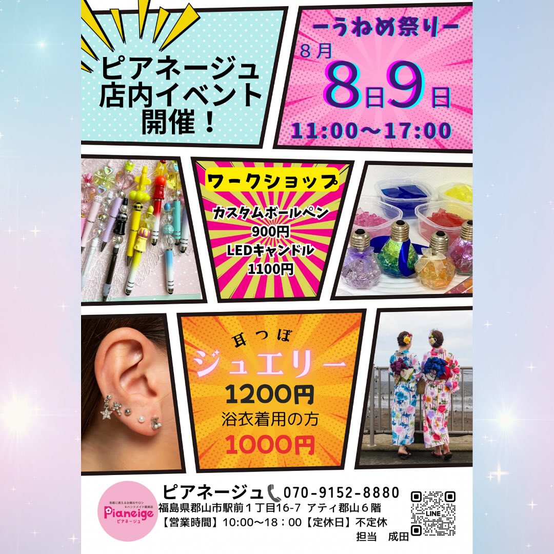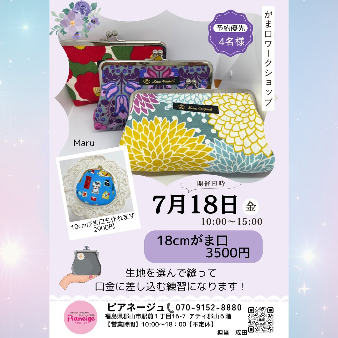 【ワークショップ情報】 8/8 @pinky_2019_ 8/9 @mirarahappy2022 作家さまによる ワークショップがあります! お気軽にDMでお問い合わせ お待ちしております ..𖥧 𖧧 ˒˒. 𖡼.𖤣𖥧 ⠜ . .𖥧 𖥧 𖧧 ˒˒. 𖡼.𖤣𖥧 ⠜ ワークショップして下さる 作家さま大募集中です ..𖥧 𖧧 ˒˒. 𖡼.𖤣𖥧 ⠜ . .𖥧 𖥧 𖧧 ˒˒. 𖡼.𖤣𖥧 ⠜ いいね️フォローを いただけますと、 大変励みになります。 〒963-8002 福島県郡山市駅前1丁目16-7 アティ郡山6階 ピアネージュ 10~18時(不定休) ..𖥧 𖧧 ˒˒. 𖡼.𖤣𖥧 ⠜ . .𖥧 𖥧 𖧧 ˒˒. 𖡼.𖤣𖥧 ⠜ #福島県 #郡山市 #pianeige #ピアネージュ #ピアネージュ郡山 #アティ郡山 #Ati郡山 #ハンドメイド #委託販売 #レンタルボックス #雑貨屋 #郡山雑貨屋 #レンタルスペース