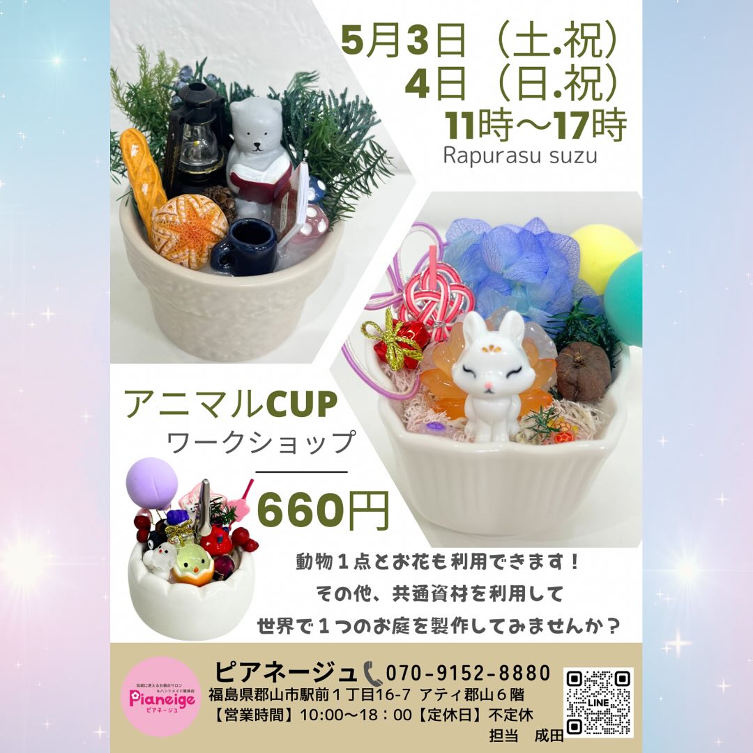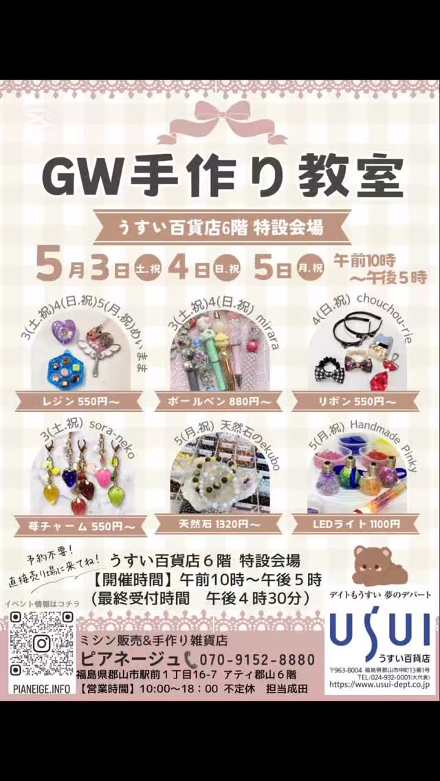 【ワークショップ情報】 GW手作り教室 5/3(土.祝) 4(日.祝) 5(月.祝) 10:00~17:00 うすい百貨店 6階 特設会場 @usui.dept 5/3(土.祝) レジンアクセサリー 550円~ @bright.sky_8 ボールペン 880円~ @mirarahappy2022 苺チャーム 550円~ @sora_neko0110 4(日.祝) レジンアクセサリー 550円~ @bright.sky_8 ボールペン 880円~ @mirarahappy2022 リボン 550円~ @chouchou_rie 5(月.祝) レジンアクセサリー 550円~ @bright.sky_8 天然石アクセサリー 1320円~ @stone_ekubo LEDキャンドル 1100 @pinky_2019_ @tii_tyann 6名の作家様と レジ&お客様対応担当の成田で 盛り上げますので ぜひ遊びにいらして下さい お得情報 うすい百貨店 GW手作り教室参加者さんには ピアネージュで使える ガチャ無料券をプレゼント ピアネージュも営業しています 店内では ☆。.:*・゜ 5/3(土.祝) 4(日.祝) アニマルcup @shell_21230 5/5(月.祝) チェコビーズ オーダー会 @mari_kosmema 店内でもワークショップで盛り上げて 下さいますので ぜひお寄り下さい❣️ 予約不要です 直接、お店にお越しくださいませ 〒963-8002 福島県郡山市駅前1丁目16-7 ATi郡山6階 Pianeigeピアネージュ 営業時間10~18時(不定休) 電話 070-9152-8880