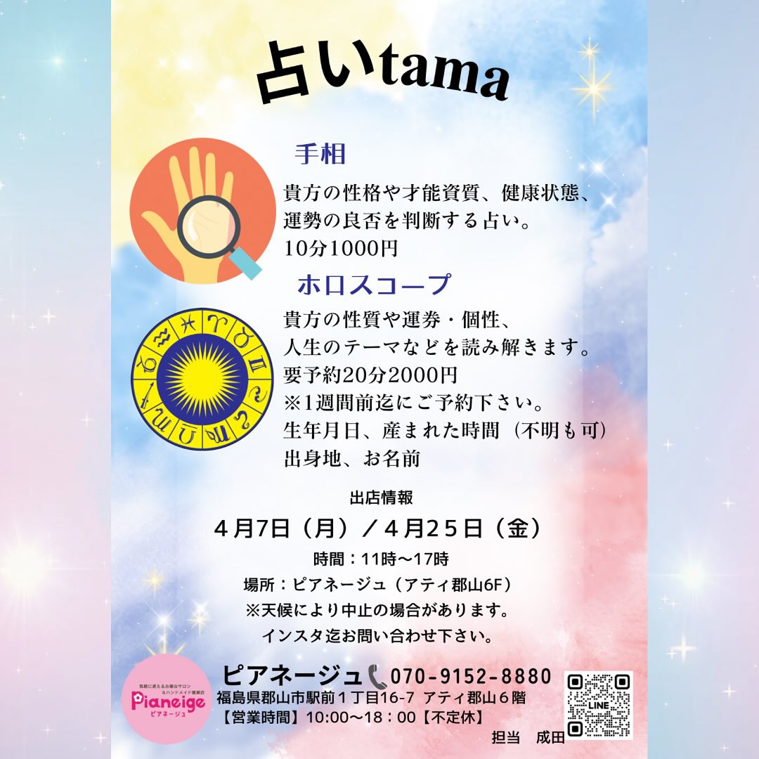 【ワークショップ情報】 @tama5577top 占いtama 作家さまによる 占いの日があります! ホロスコープは ✤生年月日 ✤産まれた時間(不明もOK) ✤出身地 ✤お名前 こちらの情報を 1週間前までお知らせください お気軽にDMでお問い合わせ お待ちしております ..𖥧 𖧧 ˒˒. 𖡼.𖤣𖥧 ⠜ . .𖥧 𖥧 𖧧 ˒˒. 𖡼.𖤣𖥧 ⠜ ワークショップして下さる 作家さま大募集中です ..𖥧 𖧧 ˒˒. 𖡼.𖤣𖥧 ⠜ . .𖥧 𖥧 𖧧 ˒˒. 𖡼.𖤣𖥧 ⠜ いいね️フォローを いただけますと、 大変励みになります。 〒963-8002 福島県郡山市駅前1丁目16-7 アティ郡山6階 ピアネージュ 10~18時(不定休) ..𖥧 𖧧 ˒˒. 𖡼.𖤣𖥧 ⠜ . .𖥧 𖥧 𖧧 ˒˒. 𖡼.𖤣𖥧 ⠜ #福島県 #郡山市 #pianeige #ピアネージュ #ピアネージュ郡山 #アティ郡山 #Ati郡山 #ハンドメイド #委託販売 #レンタルボックス #雑貨屋 #郡山雑貨屋 #レンタルスペース