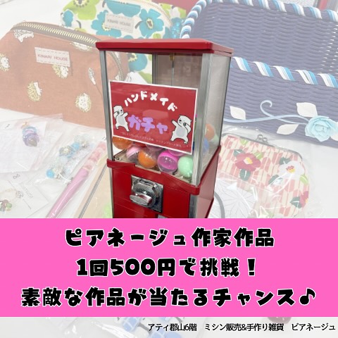 ピアネージュ店内に ガチャ機が入りました❣️ 1回500円メダルをレジにて購入ください 作家様方の素敵な作品が 当たります レトロなガチャ機 とっても可愛いです❣️ ぜひ気軽にチャレンジを