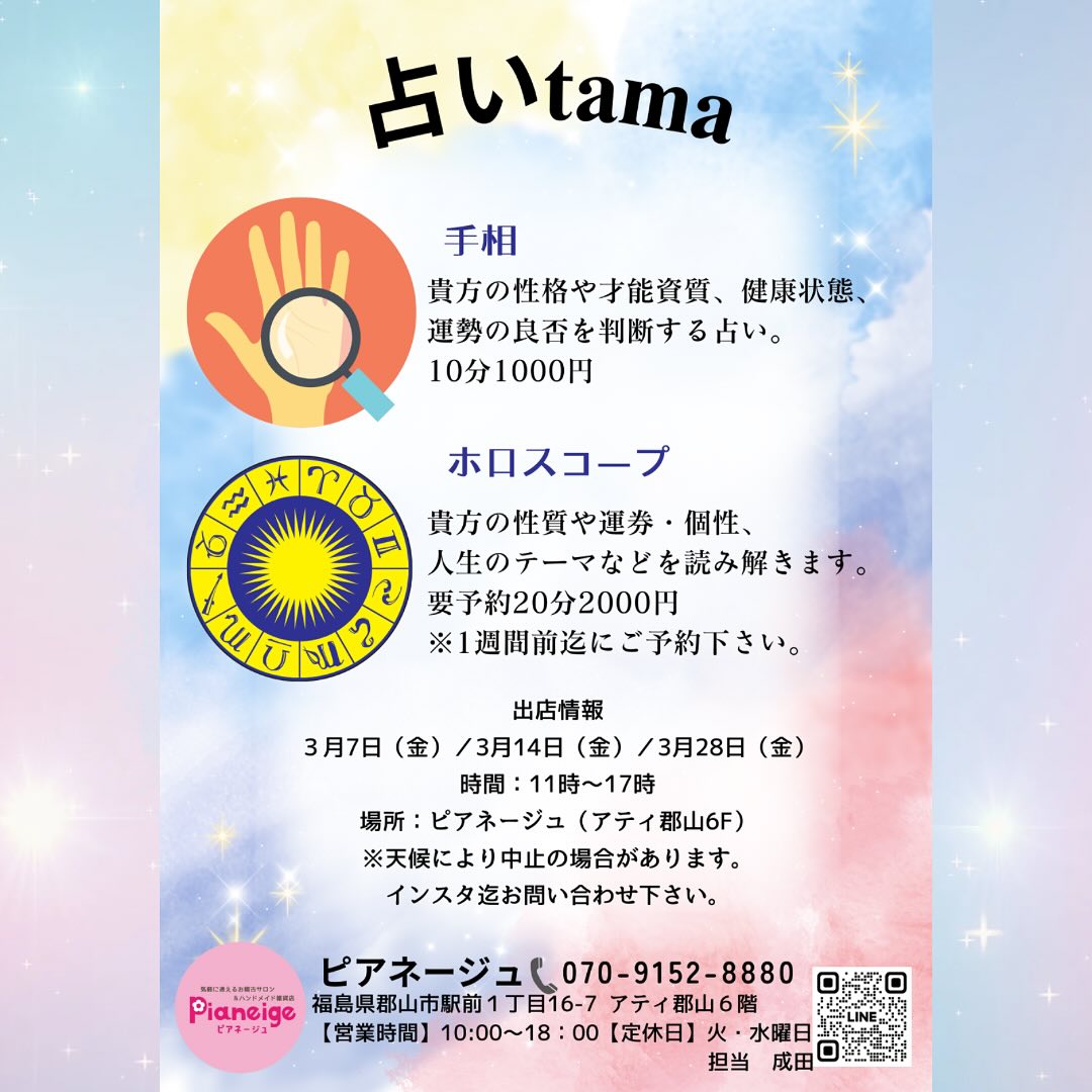 【ワークショップ情報】 @tama5577top 占いtama 作家さまによる 占いの日があります! ホロスコープは ✤生年月日 ✤産まれた時間(不明もOK) ✤出身地 ✤お名前 こちらの情報を 1週間前までお知らせください お気軽にDMでお問い合わせ お待ちしております ..𖥧 𖧧 ˒˒. 𖡼.𖤣𖥧 ⠜ . .𖥧 𖥧 𖧧 ˒˒. 𖡼.𖤣𖥧 ⠜ ワークショップして下さる 作家さま大募集中です ..𖥧 𖧧 ˒˒. 𖡼.𖤣𖥧 ⠜ . .𖥧 𖥧 𖧧 ˒˒. 𖡼.𖤣𖥧 ⠜ いいね️フォローを いただけますと、 大変励みになります。 〒963-8002 福島県郡山市駅前1丁目16-7 アティ郡山6階 ピアネージュ 10~18時(火水は定休日) ..𖥧 𖧧 ˒˒. 𖡼.𖤣𖥧 ⠜ . .𖥧 𖥧 𖧧 ˒˒. 𖡼.𖤣𖥧 ⠜ #福島県 #郡山市 #pianeige #ピアネージュ #ピアネージュ郡山 #アティ郡山 #Ati郡山 #ハンドメイド #委託販売 #レンタルボックス #雑貨屋 #郡山雑貨屋 #レンタルスペース