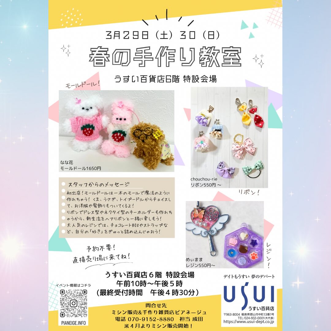 【ワークショップ情報】 春の手作り教室 3/29(土)30(日) 10:00~17:00 うすい百貨店 6階 特設会場 @usui.dept 3/29(土)30(日) リボンアクセサリー 550円~ @chouchou_rie レジンアクセサリー 550円~ @bright.sky_8 モールドール 1650円 @nana.9945 3名の作家様と レジ&お客様対応担当の成田で 盛り上げますので ぜひ遊びにいらして下さい ピアネージュも営業しています ピアネージュ店内では アニマルcup @shell_21230 店内でもワークショップで盛り上げて 下さいますので ぜひお寄り下さい❣️ 予約不要です 直接、お店にお越しくださいませ 〒963-8002 福島県郡山市駅前1丁目16-7 ATi郡山6階 Pianeigeピアネージュ 営業時間10~18時(火水は定休日) 電話 070-9152-8880
