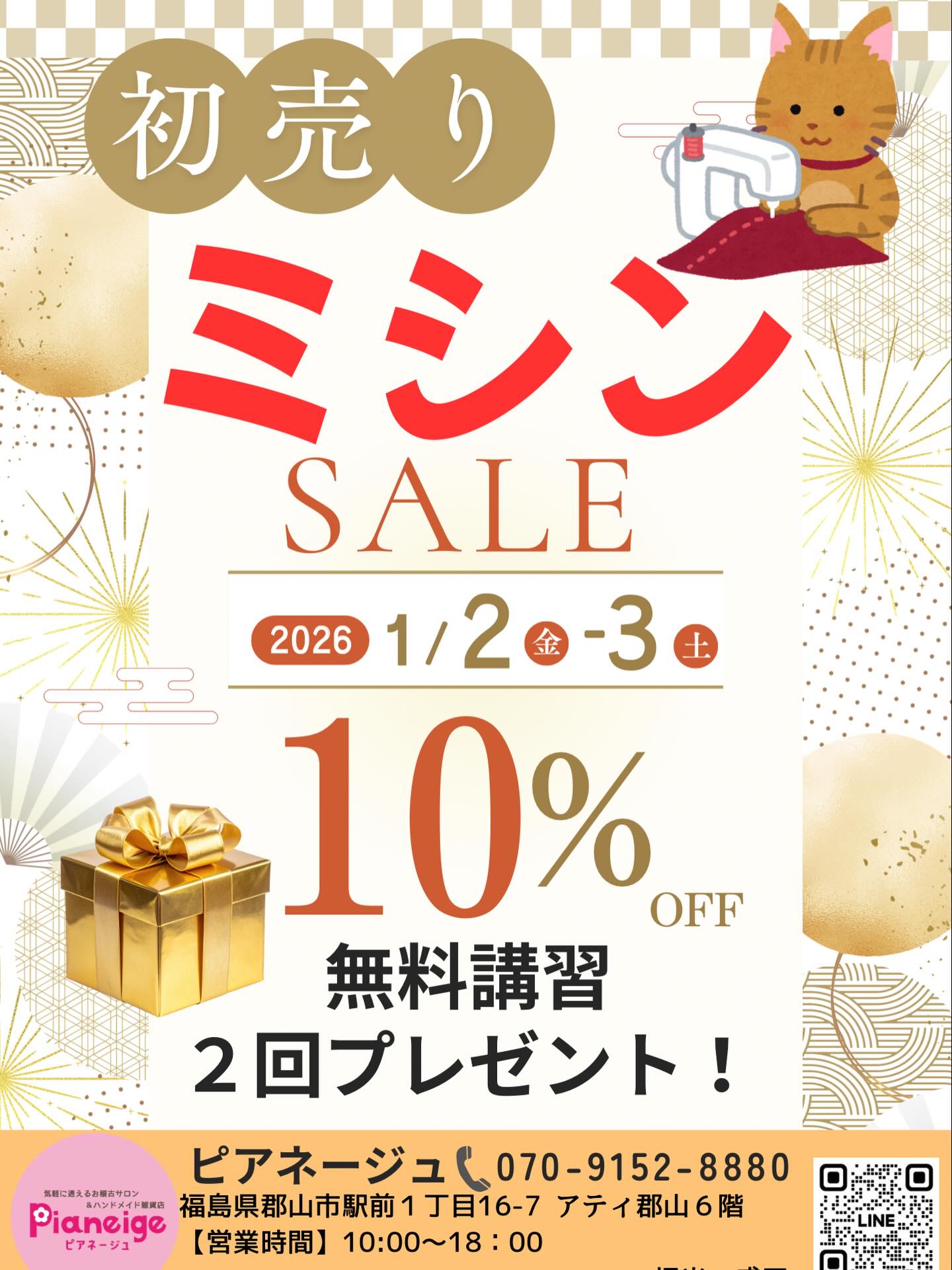 1/2 9:30から初売りスタート 1/2.3はミシン10%off 10%offは初売りだけ️ ぜひこの機会にお求めください 無料講習2回付き 使い方は何度でもレッスン可能 一緒にミシン楽しみましょう ..𖥧 𖧧 ˒˒. 𖡼.𖤣𖥧 ⠜ . .𖥧 𖥧 𖧧 ˒˒. 𖡼.𖤣𖥧 ⠜ いいね️フォローを いただけますと、 大変励みになります。 〒963-8002 福島県郡山市駅前1丁目16-7 ATi郡山6階 ピアネージュ 10~18時 ..𖥧 𖧧 ˒˒. 𖡼.𖤣𖥧 ⠜ . .𖥧 𖥧 𖧧 ˒˒. 𖡼.𖤣𖥧 ⠜ #福島県 #郡山市 #pianeige #ピアネージュ #ピアネージュ郡山 アティ郡山 Ati郡山 ハンドメイド 委託販売 レンタルボックス 雑貨屋 郡山雑貨屋 レンタルスペース 手作り雑貨 レンタルスペース ミシン販売 ミシン修理 ミシン部品 ジャノメ ブラザー JUKI ベビーロック 職業用ミシン 衣縫人 糸取物語 SL700EX 極