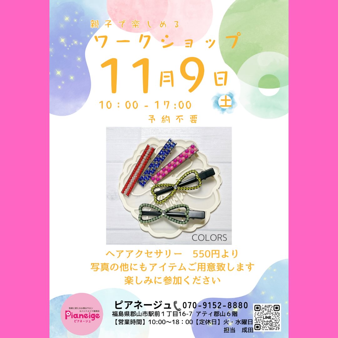 【ワークショップ情報】 @colors_beads_accessary ヘアアクセサリー ミニフレームのワークショップ 11:00~17:00 ヘアアクセサリー550円~ ミニフレームもキラキラして可愛い のですよ❣️ 写真無くてごめんなさい 予約不要です 直接、お店にお越しくださいませ 〒963-8002 福島県郡山市駅前1丁目16-7 ATi郡山6階 Pianeigeピアネージュ 営業時間10~18時(火水は定休日) 電話 070-9152-8880