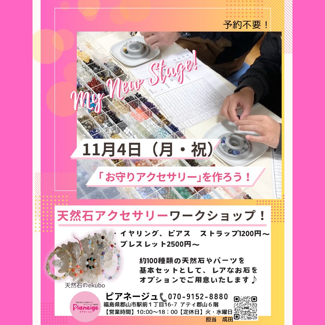 【ワークショップ情報】 @stone_ekubo 天然石アクセサリーのワークショップ イヤリング、ピアス、ストラップ 1200円~ ブレスレット 2500円~ 約100種類の天然石やパーツを 基本セットとして レアなお石をオプションでお持ちくださいます この機会にお守りアクセサリーを 一緒に作りましょう 予約不要です 直接、お店にお越しくださいませ 〒963-8002 福島県郡山市駅前1丁目16-7 ATi郡山6階 Pianeigeピアネージュ 営業時間10~18時(火水は定休日) 電話 070-9152-8880
