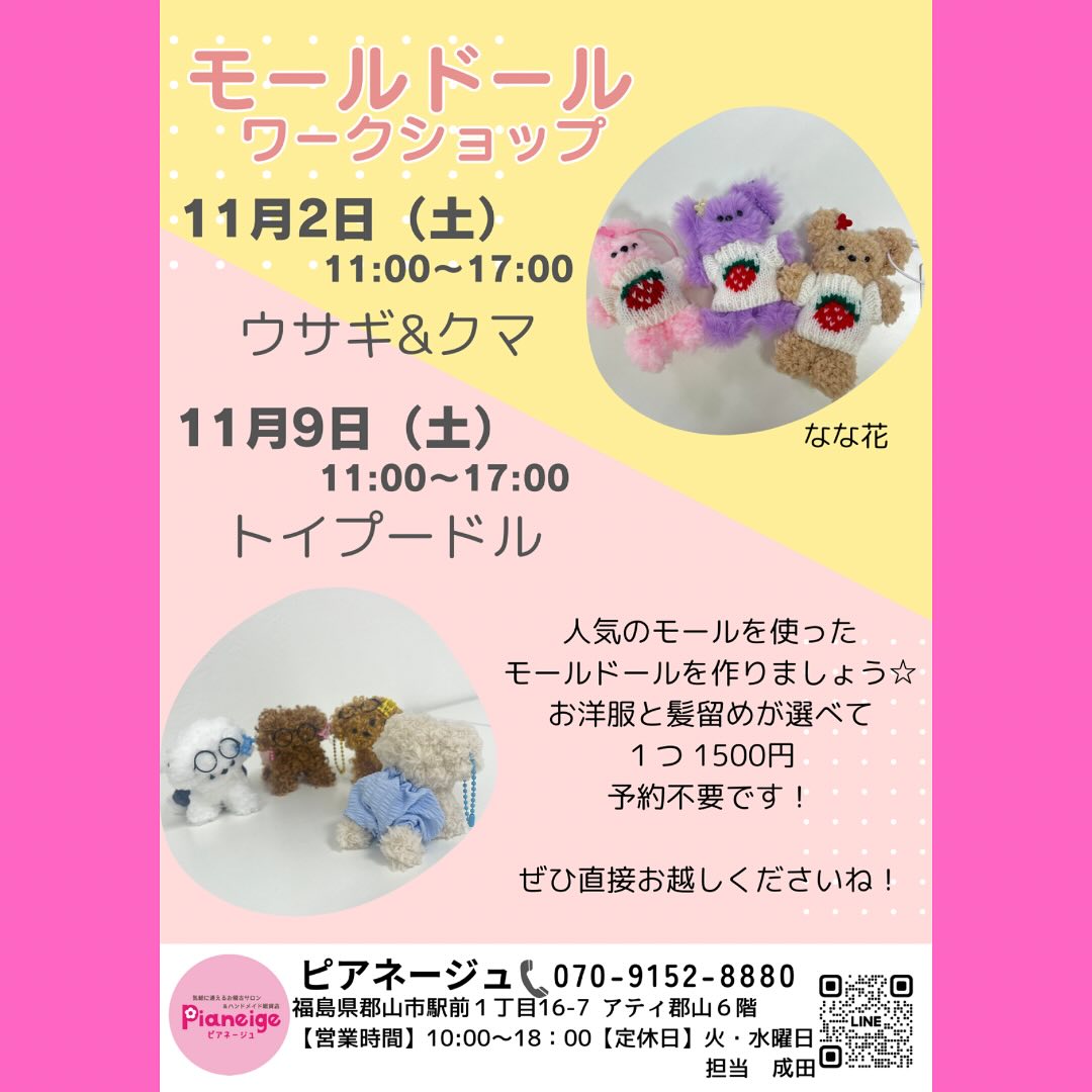【ワークショップ情報】 11/2(土)11:00~17:00 くまとうさぎ 11/9(土)11:00~17:00 @nana.9945 トイプードル 作家さまによる ワークショップがあります❣️ 〈予約不要〉 1つ1500円 お洋服と髪飾り付き 大人気のモールドールを ぜひ一緒に作りましょう お気軽にDMでお問い合わせ お待ちしております ..𖥧 𖧧 ˒˒. 𖡼.𖤣𖥧 ⠜ . .𖥧 𖥧 𖧧 ˒˒. 𖡼.𖤣𖥧 ⠜ ワークショップして下さる 作家さま大募集中です ..𖥧 𖧧 ˒˒. 𖡼.𖤣𖥧 ⠜ . .𖥧 𖥧 𖧧 ˒˒. 𖡼.𖤣𖥧 ⠜ 〒963-8002 福島県郡山市駅前1丁目16-7 ATi郡山6階 Pianeigeピアネージュ 10~18時(火水は定休日)
