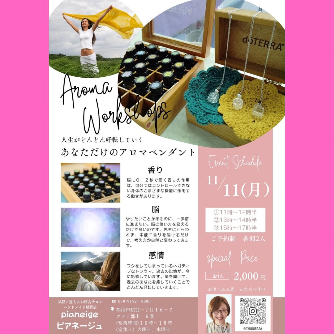 【ワークショップ情報】 @gyuuubaaa 人生がどんどん好転していく あなただけのアロマペンダント のワークショップ 11/11(月) 11:00~12:30 13:00~14:30 15:00~17:30 ご予約制 各回2名 予約は作家さまに直接 もしくはピアネージュまで 〒963-8002 福島県郡山市駅前1丁目16-7 ATi郡山6階 Pianeigeピアネージュ 営業時間10~18時(火水は定休日) 電話 070-9152-8880