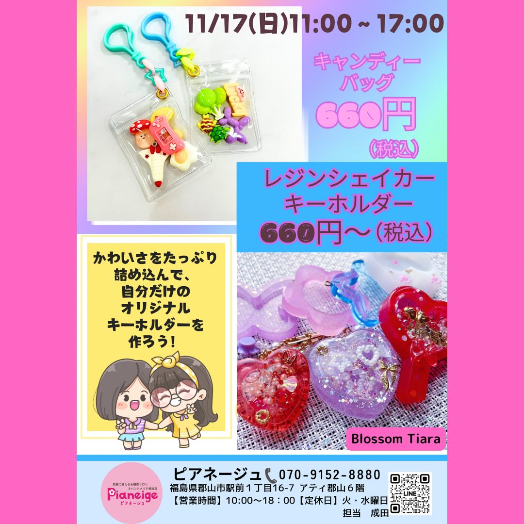 ︎シェイカーキーホルダーワークショップ キャンディーバッグワークショップ 11:00~17:00 @blos_somtiara 中にビーズを入れたり 推しの名前を付けたりと オリジナルのキーホルダーを作りましょう❣️ 予約不要です ぜひ可愛いキーホルダーを作りに いらして下さい 〒963-8002 福島県郡山市駅前1丁目16-7 ATi郡山6階 Pianeigeピアネージュ 営業時間10~18時(火水は定休日) 予約電話 070-9152-8880