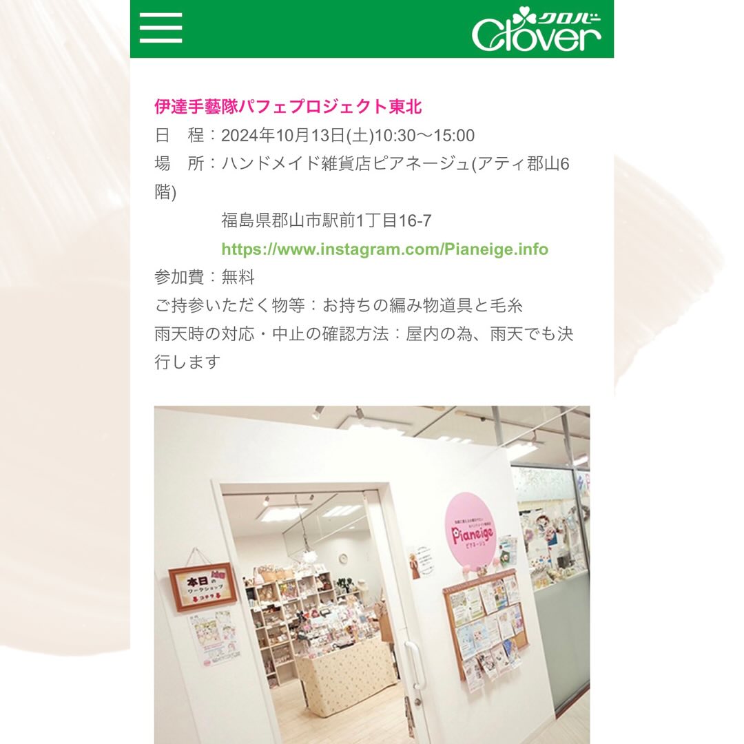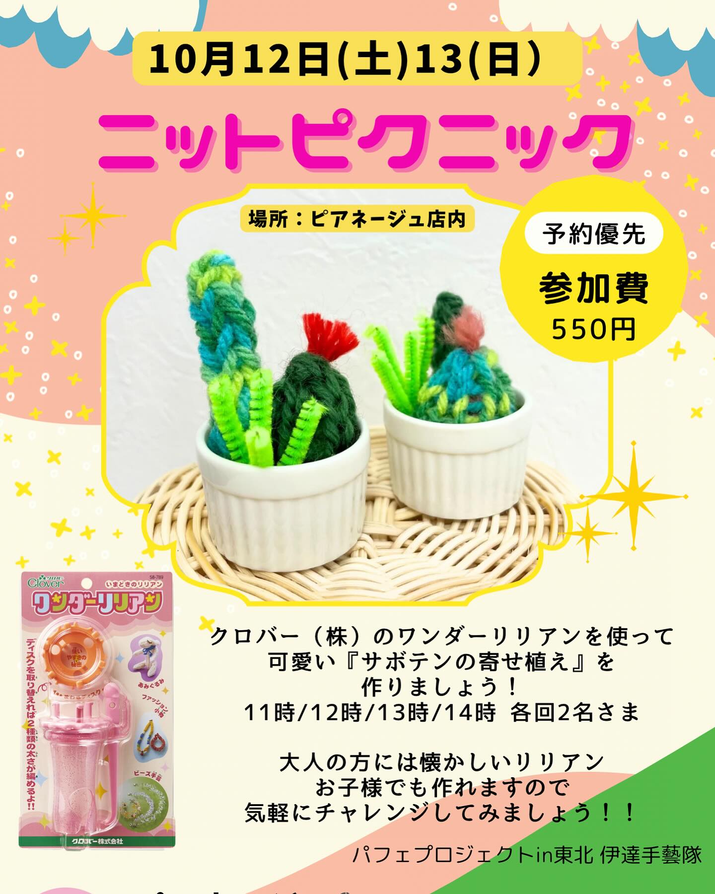 【ワークショップ情報】 @info_clover @pafetohoku 10/12(土)10/13(日)10:30~15:00 ピアネージュ店内にて #ニットピクニック 開催致します あみものとピクニックを楽しむ のんびりイベントです 参加無料で毛糸とあみ針お貸しします 簡単な編み図もご用意していますので 気軽にお寄り下さい その他、懐かしいリリアンを使った 可愛いサボテンの寄せ植えも 550円で作ることが出来ます 気軽にお店にお寄り下さい お待ちしております ..𖥧 𖧧 ˒˒. 𖡼.𖤣𖥧 ⠜ . .𖥧 𖥧 𖧧 ˒˒. 𖡼.𖤣𖥧 ⠜ ワークショップして下さる 作家さま大募集中です ..𖥧 𖧧 ˒˒. 𖡼.𖤣𖥧 ⠜ . .𖥧 𖥧 𖧧 ˒˒. 𖡼.𖤣𖥧 ⠜ いいね️フォローを いただけますと、 大変励みになります。 〒963-8002 福島県郡山市駅前1丁目16-7 ATi郡山6階 Pianeigeピアネージュ 10~18時(火水は定休日) ..𖥧 𖧧 ˒˒. 𖡼.𖤣𖥧 ⠜ . .𖥧 𖥧 𖧧 ˒˒. 𖡼.𖤣𖥧 ⠜ #福島県 #郡山市 #pianeige #ピアネージュ #ピアネージュ郡山 #アティ郡山 #Ati郡山 #ハンドメイド #委託販売 #レンタルボックス #雑貨屋 #郡山雑貨屋 #レンタルスペース