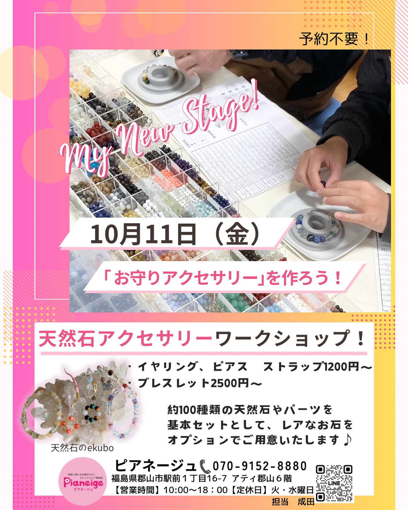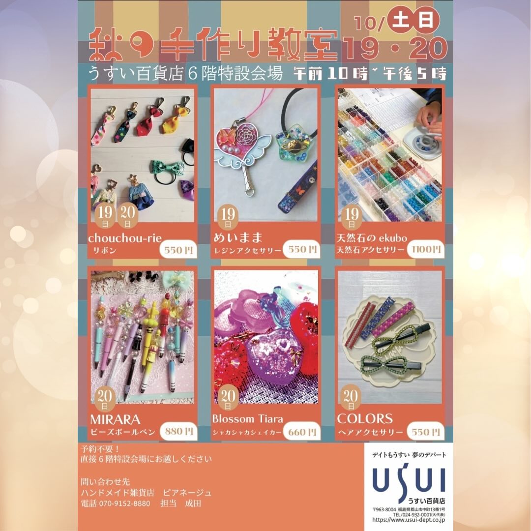 【ワークショップ情報】 秋の手作り教室 10/19(土)20(日) 10:00~17:00 うすい百貨店 6階 特設会場 @usui.dept 10/19(土) リボンアクセサリー 550円~ @chouchou_rie レジンアクセサリー 550円~ @bright.sky_8 天然石アクセサリー 1100円~ @stone_ekubo 10/20(日) ビーズボールペン 880円~ @mirarahappy2022 レジンシャカシャカシェイカー 660円~ @blos_somtiara ヘアアクセサリー 550円~ @colors_beads_accessary 6名の作家様と レジ&お客様対応担当の成田で 盛り上げますので ぜひ遊びにいらして下さい ピアネージュも営業しています ピアネージュ店内では ビーズアクセサリーワークショップ @liizbeet アニマルcup @shell_21230 店内でもワークショップで盛り上げて 下さいますので ぜひお寄り下さい❣️ 予約不要です 直接、お店にお越しくださいませ 〒963-8002 福島県郡山市駅前1丁目16-7 ATi郡山6階 Pianeigeピアネージュ 営業時間10~18時(火水は定休日) 電話 070-9152-8880