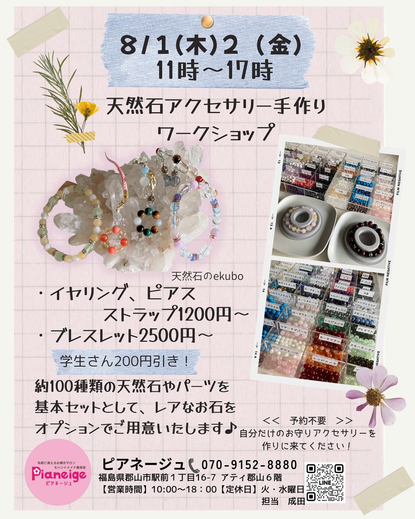 【ワークショップ情報】 @stone_ekubo 天然石アクセサリーのワークショップ 6/23(日)11:00~17:00 イヤリング、ピアス、ストラップ 1200円~ ブレスレット 2500円~ 約100種類の天然石やパーツを 基本セットとして レアなお石をオプションでお持ちくださいます この機会にお守りアクセサリーを 一緒に作りましょう 予約不要です 直接、お店にお越しくださいませ 〒963-8002 福島県郡山市駅前1丁目16-7 ATi郡山6階 Pianeigeピアネージュ 営業時間10~18時(火水は定休日) 電話 070-9152-8880