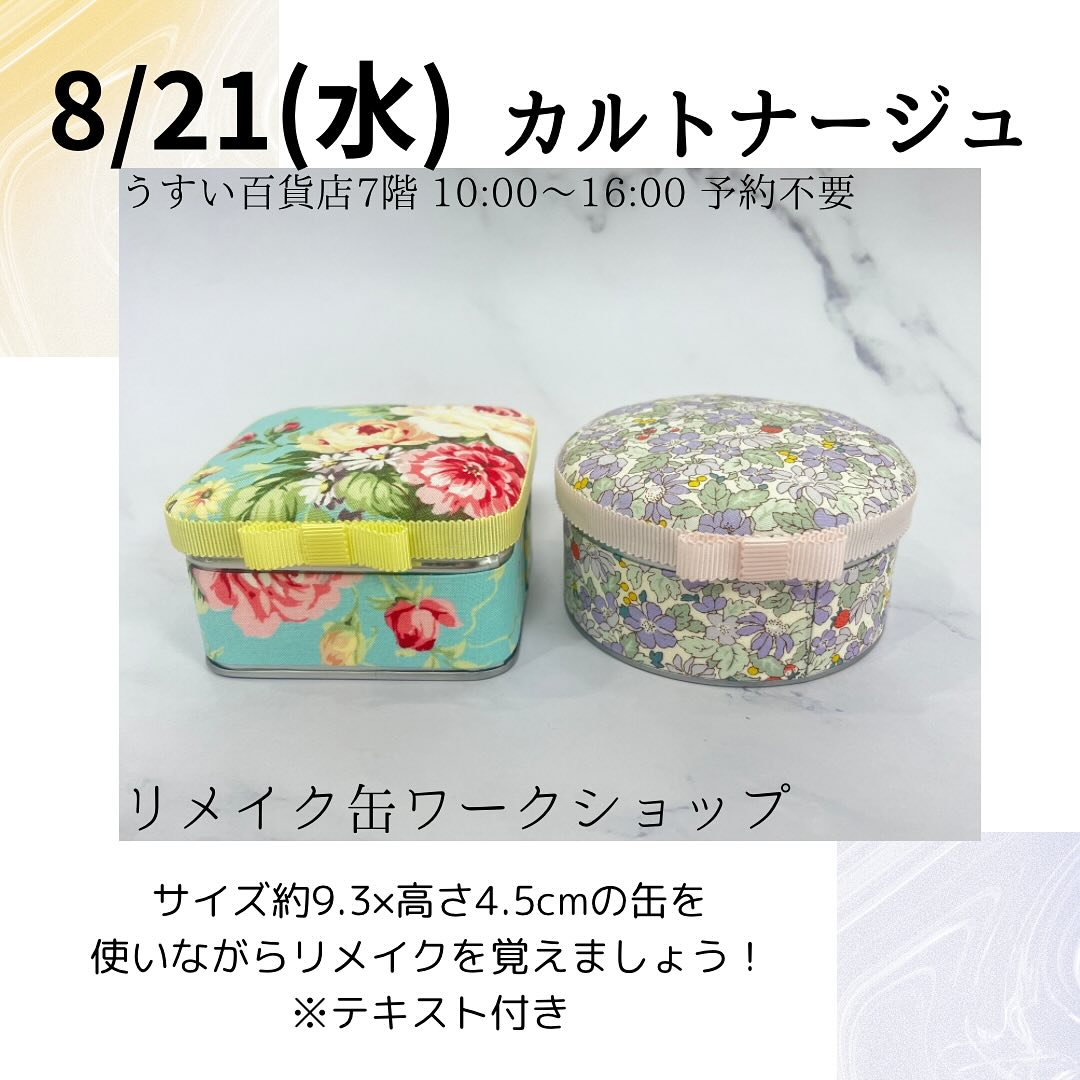 【ワークショップ情報】 8/21(水)10:00~17:00 うすい百貨店7階イベントスペースにて Brillante さまのイベントに 1日ワークショップ致します カルトナージュで作るリメイク缶です 覚えて頂ければ ご自宅にある缶なども可愛く出来ますので ぜひこの機会にリメイクの仕方を覚えませんか? オリジナルテキスト付き1320円(税込) 2つ目からは1100円(税込)にて 作って頂く事も可能です ご興味のある方は ぜひ、予約不要ですので 気軽に遊びにいらしてください❣️ ピアネージュ 店長成田 場所は うすい百貨店エスカレーター前です!