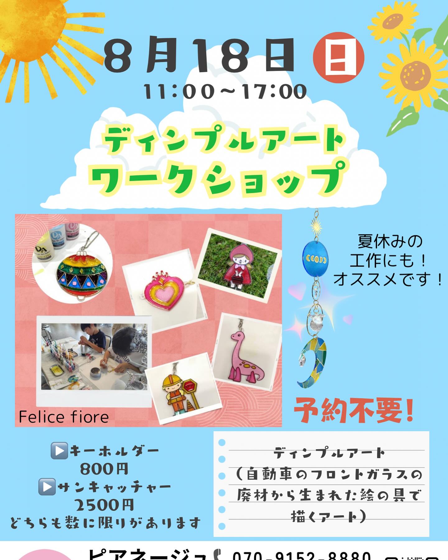 【ワークショップ情報】 @felice_fiore_me 作家さまによる ワークショップがあります❣️ ディンプルアートワークショップ 8/18(日)11:00~17:00 キーホルダー 800円 サンキャッチャー 2500円 どちらも数に限りがあります! ディンプルアートとは 自動車のフロントガラスの廃材から生まれた 絵の具で描くアート 予約不要ですので 直接売場にお越しください 〒963-8002 福島県郡山市駅前1丁目16-7 ATi郡山6階 Pianeigeピアネージュ 営業時間10~18時(火水は定休日) 予約電話 070-9152-8880