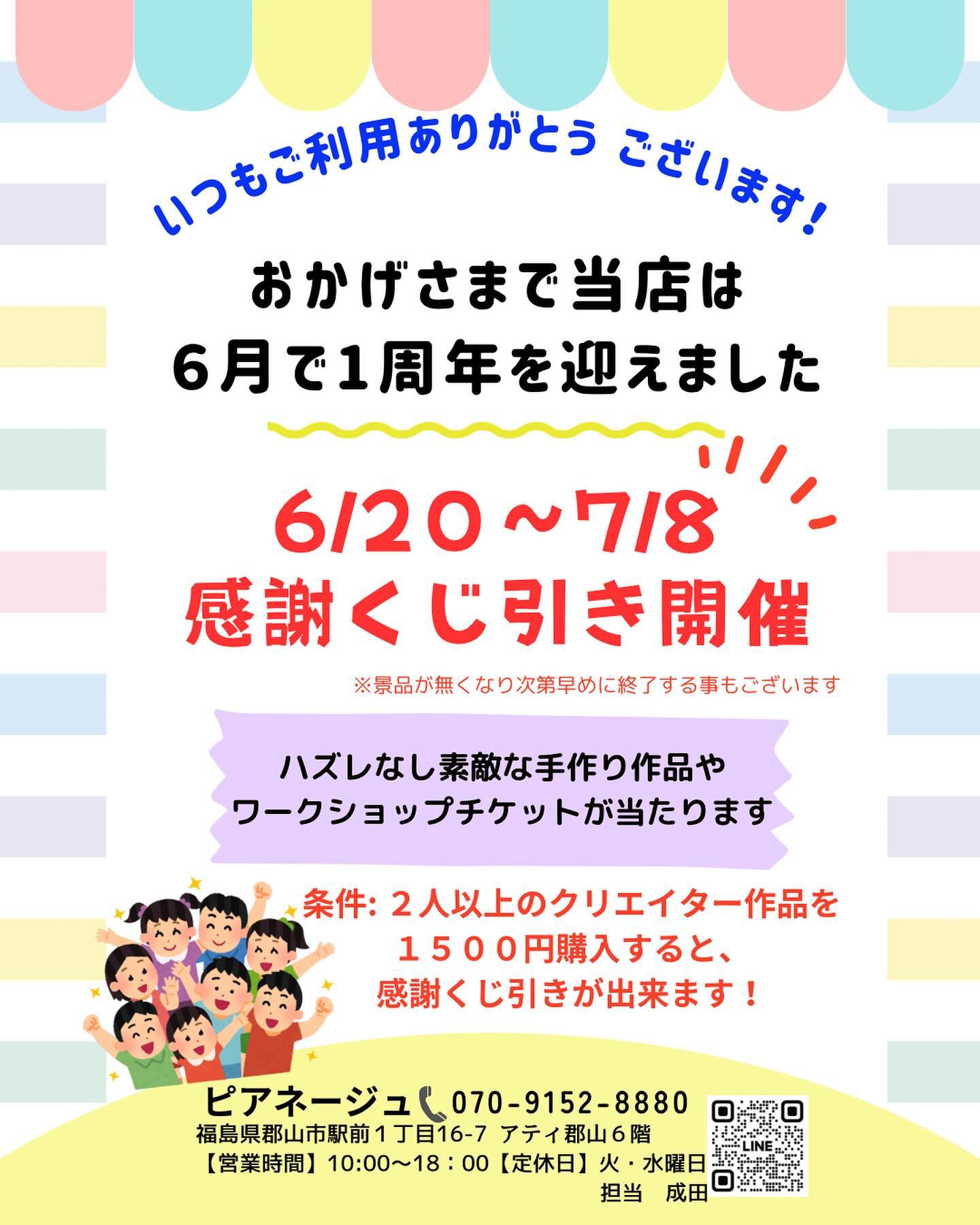 いつも当店をご利用下さり ありがとうございます 昨年2023年6月3日プレオープンから 1年がたちました (6/19グランドオープン) あっという間の1年で毎日が楽しく 感謝の日々でございます 感謝の気持ちを込めまして 6/20~7/8 《感謝くじ引き開催》 2人以上の作家様作品を1500円購入すると 感謝くじを引いて頂けます*゜ 作家様からの提供作品や ワークショップチケットなど ハズレ無しの感謝くじです ぜひこの機会に お買い物にいらしてください お取り置きして 6/20以降のお買い物もOKです🤭 皆さまの起こしを 心よりお待ちしております❣️ 2年目もどうぞよろしくお願いいたします ピアネージュ 店長 成田 ..𖥧 𖧧 ˒˒. 𖡼.𖤣𖥧 ⠜ . .𖥧 𖥧 𖧧 ˒˒. 𖡼.𖤣𖥧 ⠜ いいね️フォローを いただけますと、 大変励みになります。 〒963-8002 福島県郡山市駅前1丁目16-7 ATi郡山6階 Pianeigeピアネージュ 10~18時(火水は定休日) ..𖥧 𖧧 ˒˒. 𖡼.𖤣𖥧 ⠜ . .𖥧 𖥧 𖧧 ˒˒. 𖡼.𖤣𖥧 ⠜ #福島県 #郡山市 #pianeige #ピアネージュ #ピアネージュ郡山 #アティ郡山 #Ati郡山 #ハンドメイド #委託販売 #レンタルボックス #雑貨屋 #郡山雑貨屋 #レンタルスペース