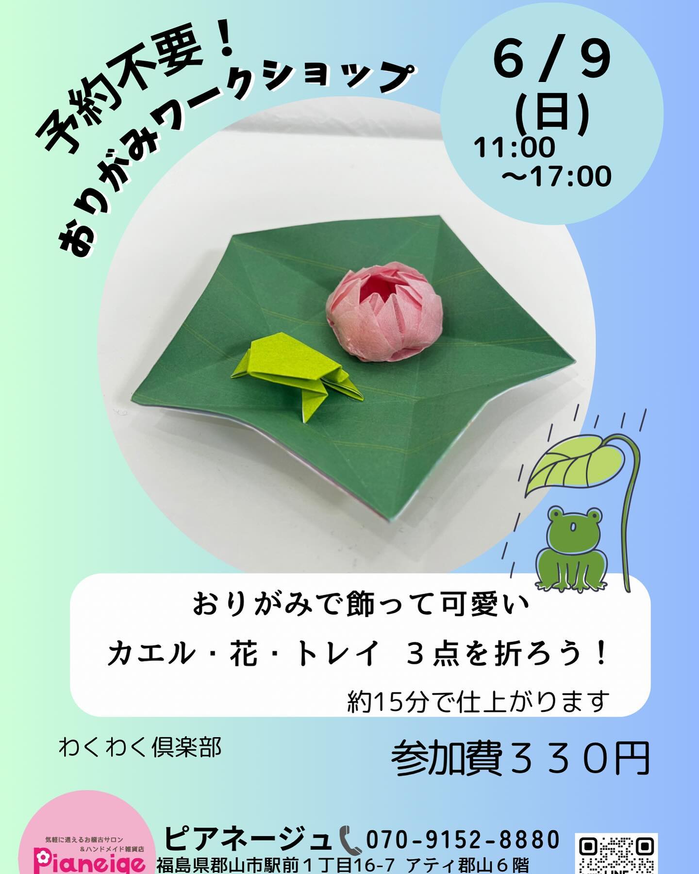 バラ作り おりがみワークショップ 6/9(日)11:00~17:00 参加費 330円 これからの季節に飾って可愛い 蓮の花とカエルとお皿の セットで作れます お子様から大人までOK 折り紙は誰でも夢中になれて楽しく オススメです 予約不要ですので 直接売場にお越しください 〒963-8002 福島県郡山市駅前1丁目16-7 ATi郡山6階 Pianeigeピアネージュ 営業時間10~18時(火水は定休日) 予約電話 070-9152-8880