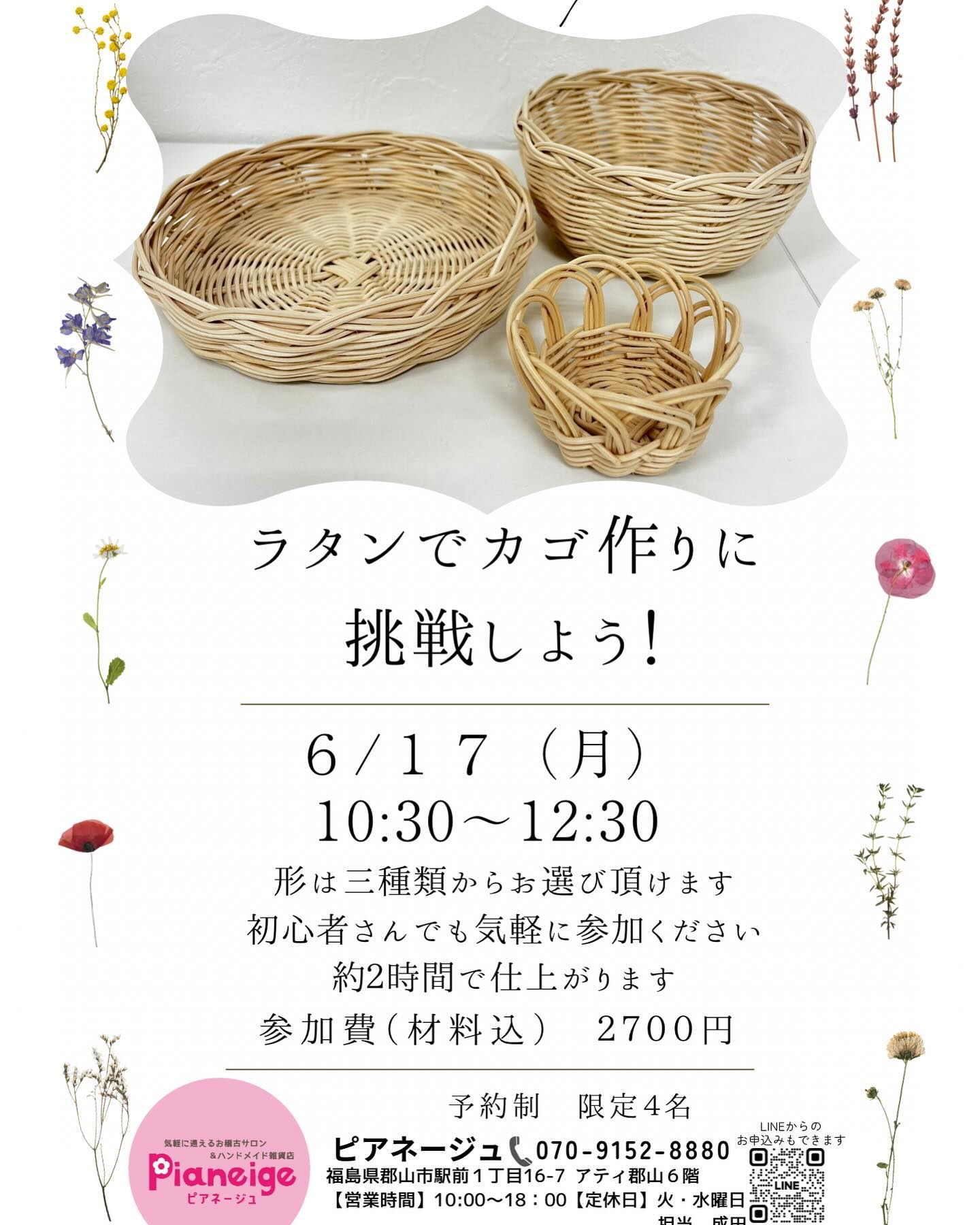 ︎ラタンでカゴ作りに挑戦しよう! 6/17(月)10:30〜12:30 @tehutehuk 大きさは3種類から選んでいただけます 初心者さんでも気軽に参加ください 約2時間で仕上がります 参加費(材料込)2700円 限定4組! ご予約はお早めに! 〒963-8002 福島県郡山市駅前1丁目16-7 ATi郡山6階 Pianeigeピアネージュ 営業時間10~18時(火水は定休日) 予約電話 070-9152-8880