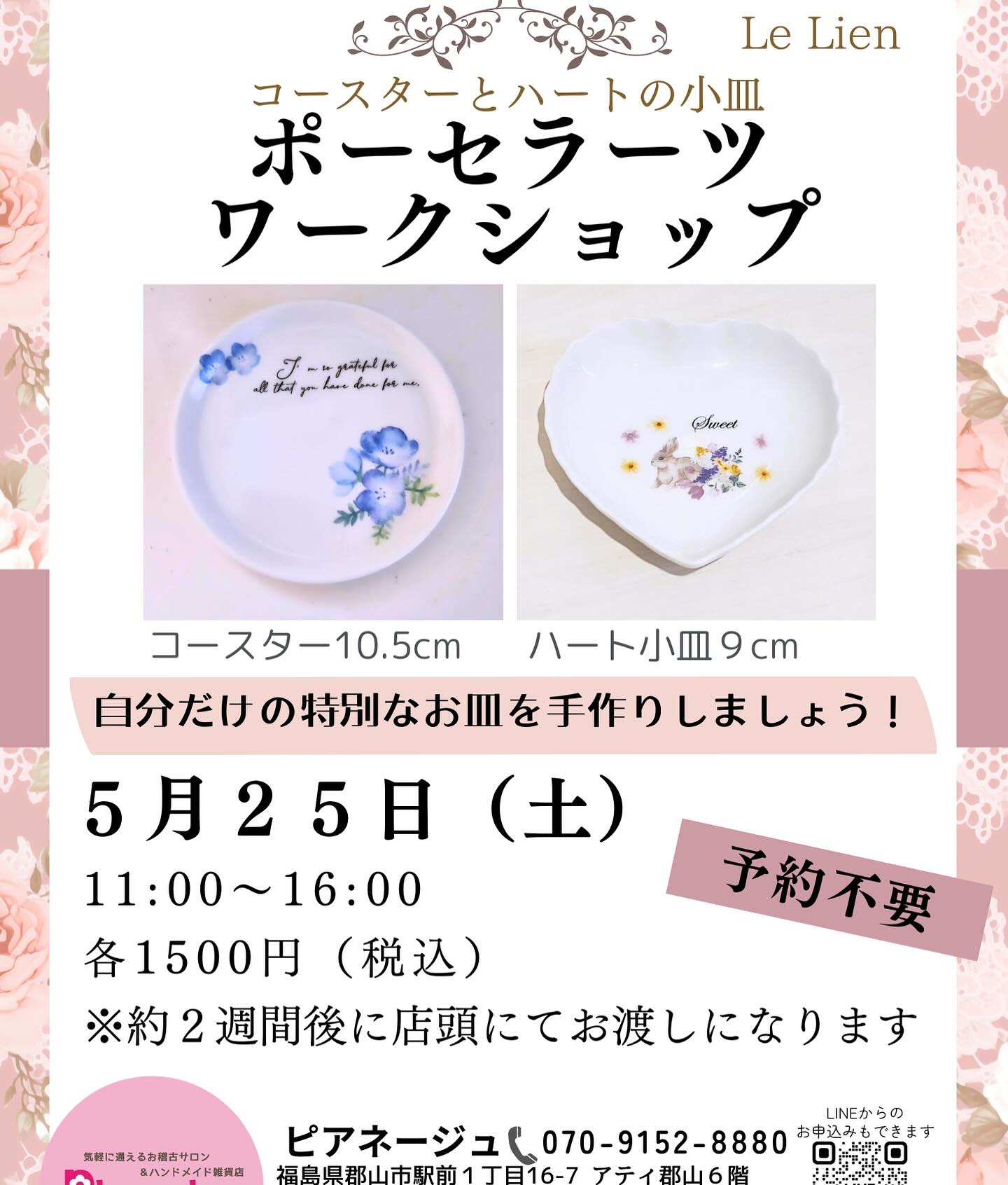 ︎自分だけの特別なお皿を作ろう @aya_le.lien 5/25(土)11:00~16:00 二種類のお皿から選んで頂けます コースター 10.5cm ハートの小皿 9cm 初心者さんでも気軽に参加ください 約2週間での仕上がりになります 参加費(材料込)1500円 予約不要 お子さんでも出来ますので ぜひ一緒に体験下さい 〒963-8002 福島県郡山市駅前1丁目16-7 ATi郡山6階 Pianeigeピアネージュ 営業時間10~18時(火水は定休日) 予約電話 070-9152-8880