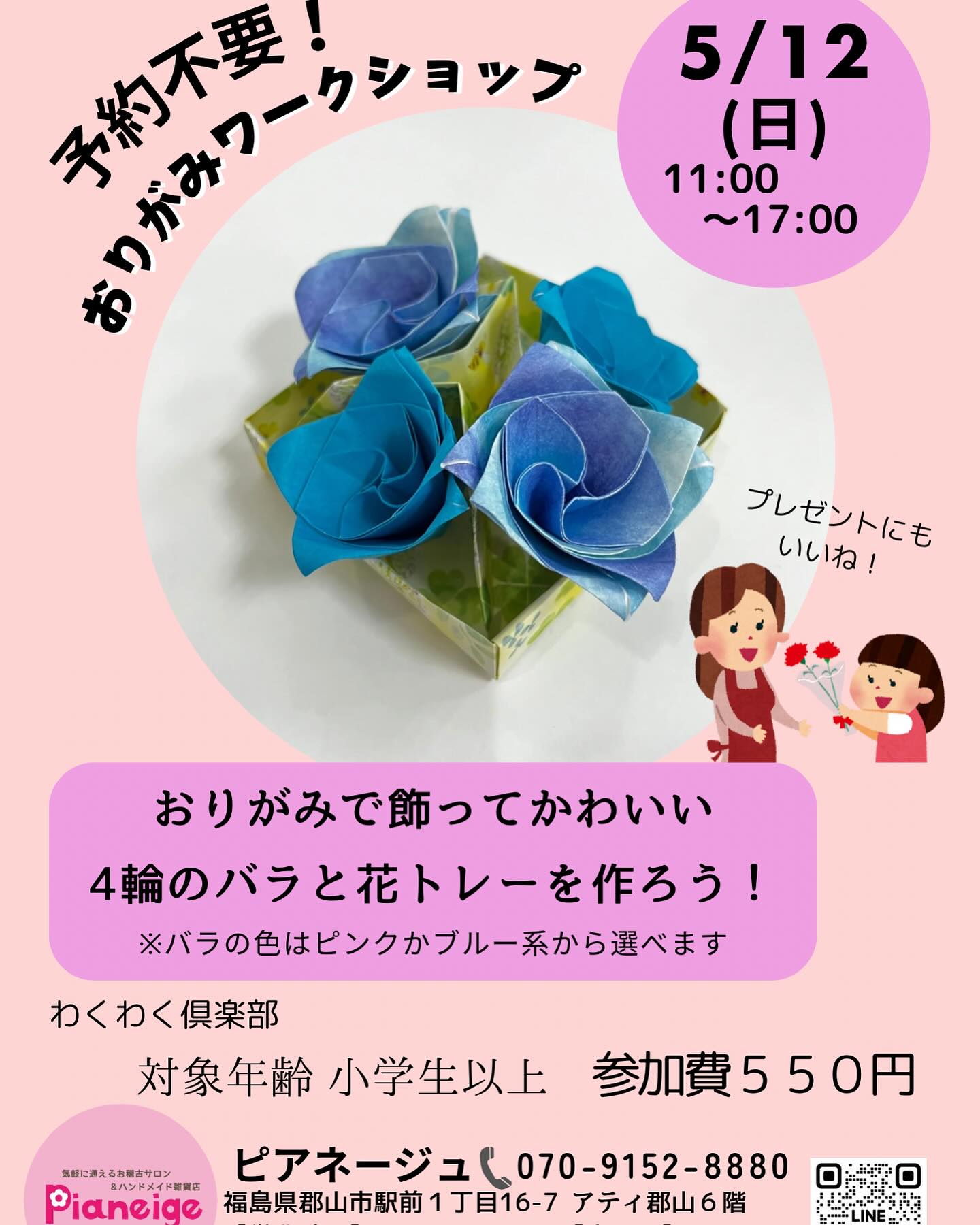 バラ作り おりがみワークショップ 5/12(日)11:00~17:00 参加費 550円 『4輪のバラ』と『花トレー』の2種類を 折って頂く事が出来ます ※バラの色はピンクか水色系から選べます! 予約不要ですので 直接売場にお越しください 〒963-8002 福島県郡山市駅前1丁目16-7 ATi郡山6階 Pianeigeピアネージュ 営業時間10~18時(火水は定休日) 予約電話 070-9152-8880