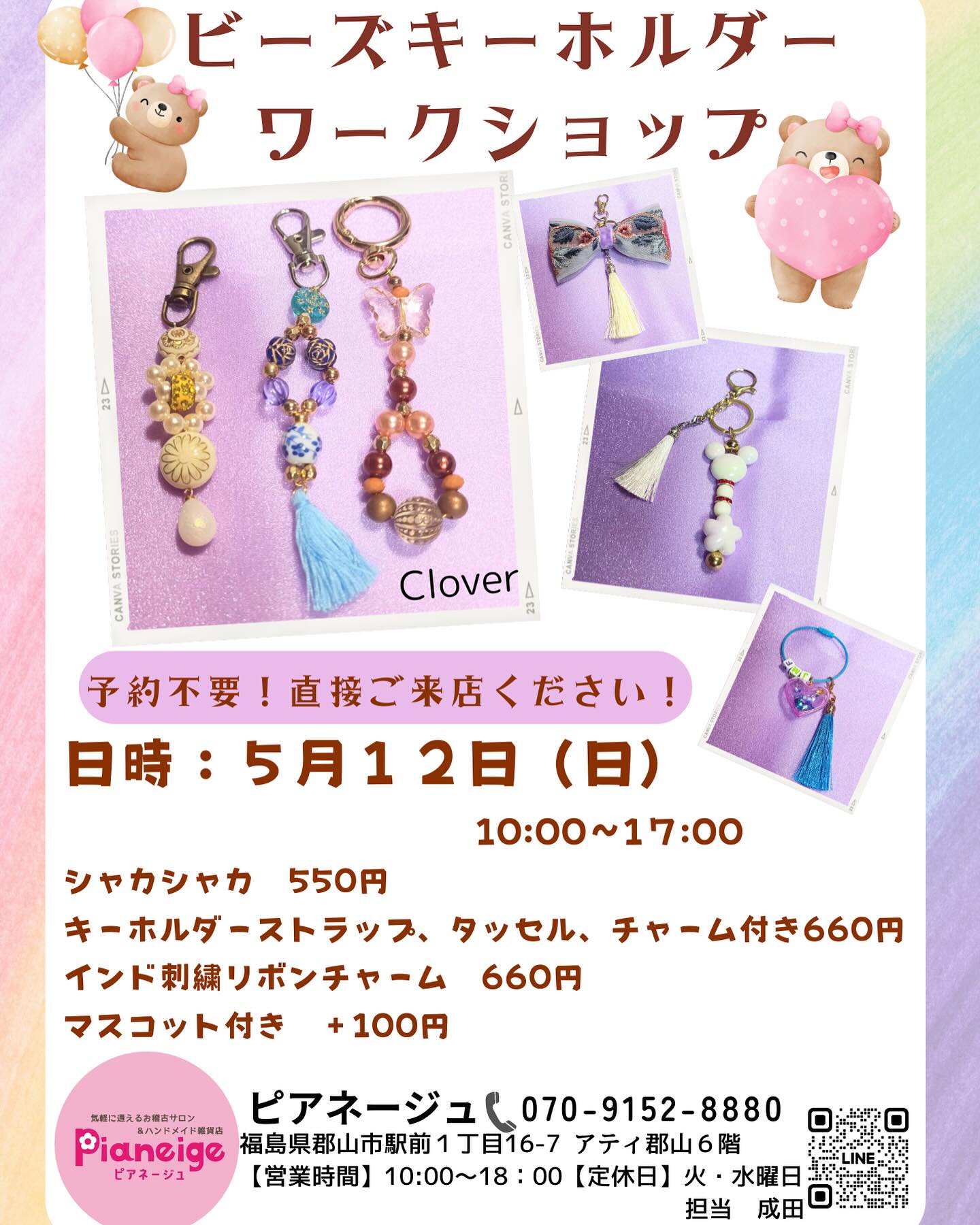 【ワークショップ情報】 @clover_hiromi ビーズキーホルダーのワークショップ 5/12(日)10:00~17:00 参加費550円~ 色々なデザインがありますので お好みの物をお選びください 予約不要です 直接、お店にお越しくださいませ 〒963-8002 福島県郡山市駅前1丁目16-7 ATi郡山6階 Pianeigeピアネージュ 営業時間10~18時(火水は定休日) 電話 070-9152-8880
