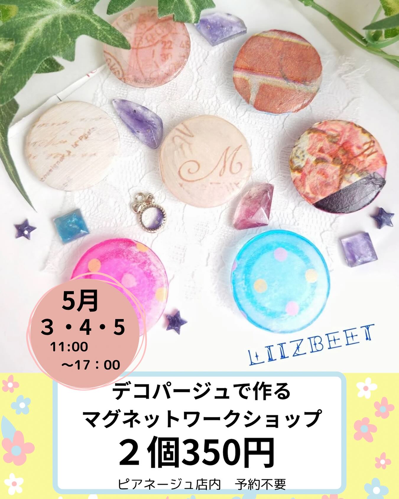 【ワークショップ情報】 @liizbeet 5/3.4.5 11:00~17:00 作家さまによる ワークショップがあります❣️ デコパージュ液を利用して 可愛いマグネット作り 〈予約不要〉 2つ350円 可愛いマグネットを作りませんか? お気軽にお待ちしております❣️ ..𖥧 𖧧 ˒˒. 𖡼.𖤣𖥧 ⠜ . .𖥧 𖥧 𖧧 ˒˒. 𖡼.𖤣𖥧 ⠜ ワークショップして下さる 作家さま大募集中です ..𖥧 𖧧 ˒˒. 𖡼.𖤣𖥧 ⠜ . .𖥧 𖥧 𖧧 ˒˒. 𖡼.𖤣𖥧 ⠜ いいね️フォローを いただけますと、 大変励みになります。 〒963-8002 福島県郡山市駅前1丁目16-7 ATi郡山6階 Pianeigeピアネージュ 10~18時(火水は定休日) ..𖥧 𖧧 ˒˒. 𖡼.𖤣𖥧 ⠜ . .𖥧 𖥧 𖧧 ˒˒. 𖡼.𖤣𖥧 ⠜ #福島県 #郡山市 #pianeige #ピアネージュ #ピアネージュ郡山 #アティ郡山 #Ati郡山 #ハンドメイド #委託販売 #レンタルボックス #雑貨屋 #郡山雑貨屋 #レンタルスペース
