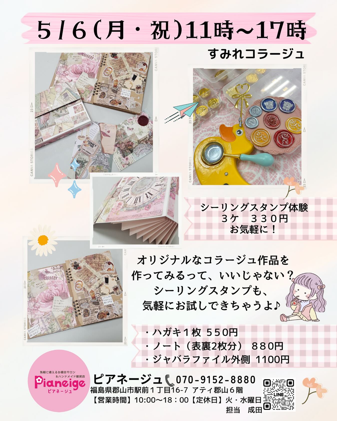 【ワークショップ情報】 コラージュ&シーリングスタンプワークショップ 5/6(月・祝)11:00~17:00 沢山の可愛いシールや紙を使って オリジナルのコラージュ作品を作ってみましょう! ハガキ1枚 550円 ノート(表裏2枚分)880円 ジャバラファイル外側 1100円 今人気のシーリングスタンプも体験できます! 3ケ 330円 予約不要ですので、 気軽に店内に遊びに来てください♪ 〒963-8002 福島県郡山市駅前1丁目16-7 ATi郡山6階 Pianeigeピアネージュ 営業時間10~18時(火水は定休日) 予約電話 070-9152-8880